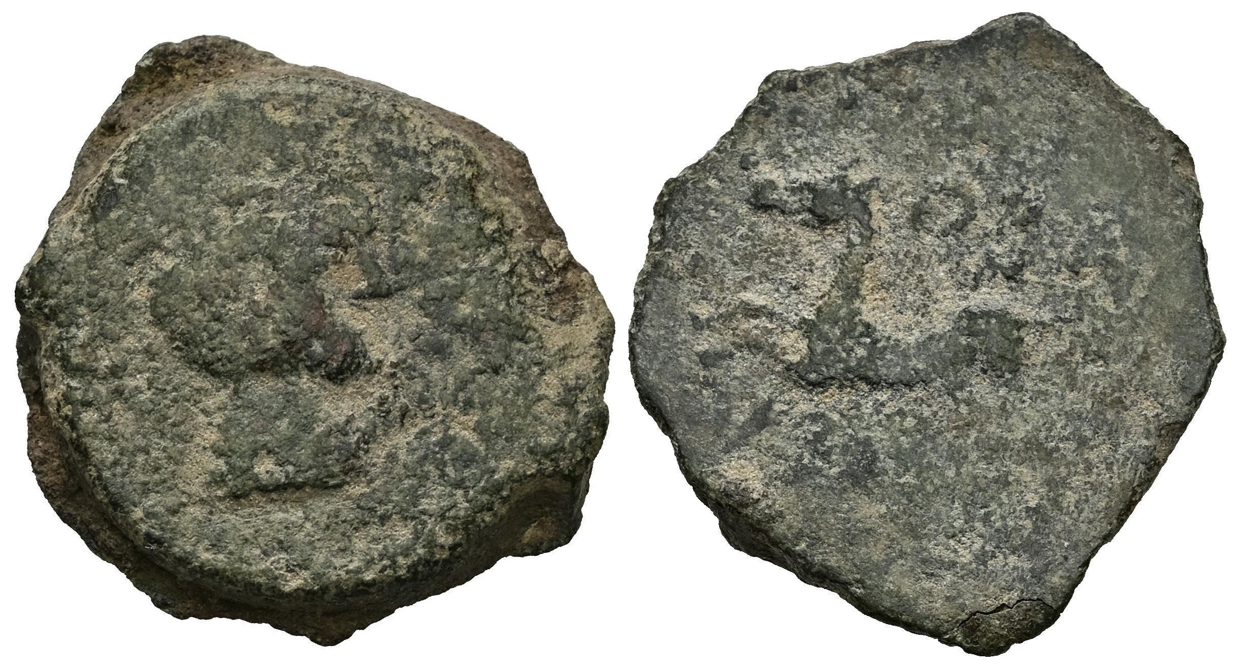 Oba. Half unit. 50 BC. Jimena de la Frontera (Cádiz). (Abh-1775). (MIB-22/2b). (Acip-950). Anv.: Helmeted male head right, palm before. Rev.: Horse left, OBA above, Libyan-Phoenician legend below. Ae. 7,04 g. Small head. Very rare. Choice F. Est...100,00.