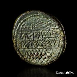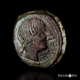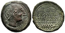 Obulco. Unit. 220-20 BC. Porcuna (Jaén). (Abh-1789). (MIB-159/14a). (Acip-2194). Anv.: Female head right, OBVLOC before. Rev.: Plow left, ear of corn below, iberian legend ORCAILV/NTUSTULDUKO left, in between. Ae. 16,58 g. Light double strike. VF. Est...100,00.