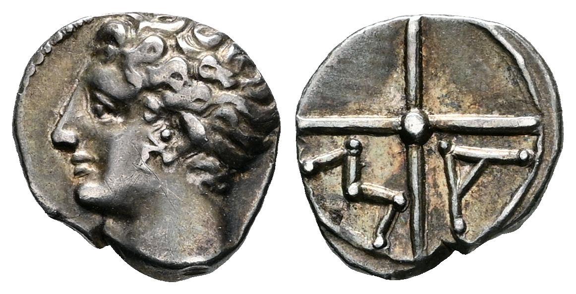Galia. Massalia. Obol. 121-82 BC. (MHM-18, 20, 31 var?). (Sch/L-147 p. 31, n° 21?). Anv.: Juvenile head of the river god Lacydon, facing left, with stylized features. Difficult-to-read monogram on the sideburn. Rev.: Wheel with M-A in the third and fourth quarters. Ag. 0,66 g. Delicate patina. Nice example. Almost XF. Est...120,00.