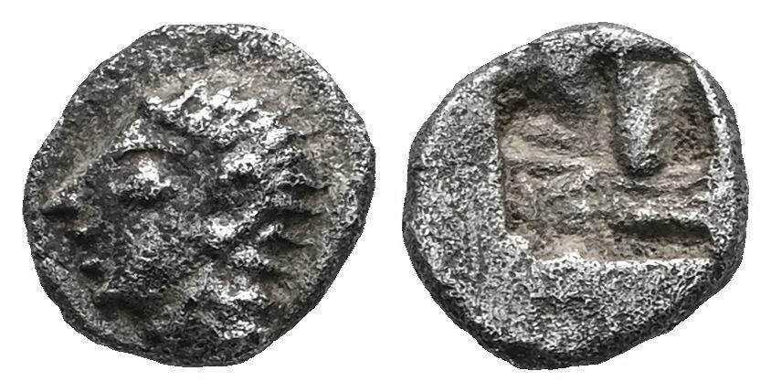 Ionia. Kolophon. Hemiobol. 530-500 BC. (Sng von Aulock-1808/9). (Sng Kayhan-342). (Sng Berry-1043). Anv.: Archaic male head of Apollo? to left. Rev.: Quadripartite incuse square punch. Ag. 0,40 g. VF. Est...80,00.