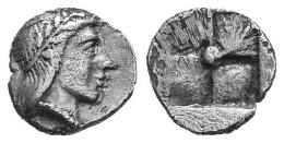 Ionia. Kolophon. Hemiobol. 450-410 BC. (Traité-II 1904). (SNG von Aulock-7904). Anv.: Diademed head of Apollo to right. Rev.: Quadripartite incuse square with pellet in center. Ag. 0,34 g. VF. Est...60,00.