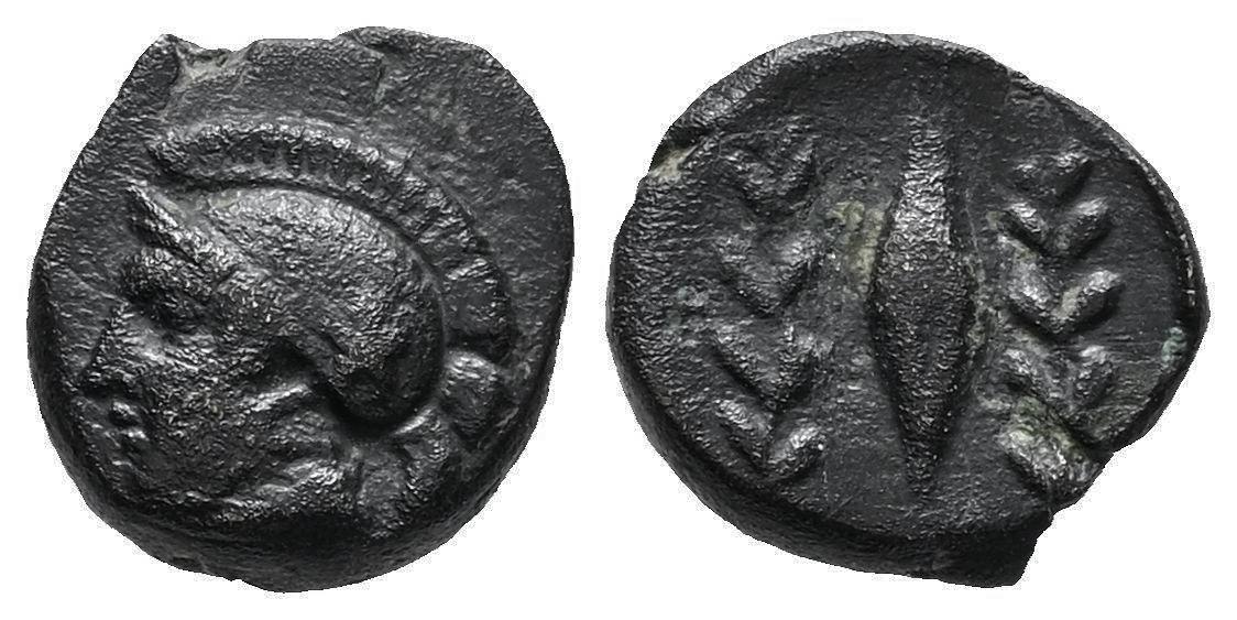 Aiolis. Elaia. AE 10. 340-300 BC. (Bmc-4). (Sng Cop-167). Anv.: Helmeted head of Athena to left. Rev.: Grain ear between two olive branches. Ae. 0,74 g. Extremely rare. Only 3 examples in Acsearch and Coinarchives. VF/Choice VF. Est...60,00.