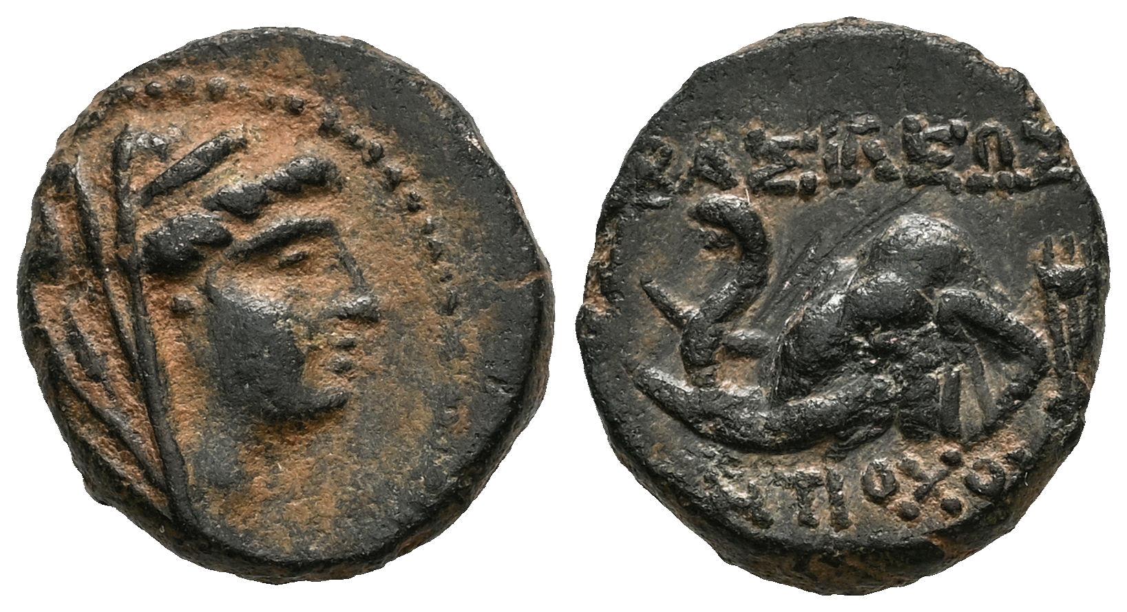 Seleukid Kingdom. Antiochos IV Epiphanes. AE 14. 175-173/2 BC. Antioch on the Orontes. (SC-1407 var.). (Hgc-9, 648). Anv.: Veiled and diademed bust of Laodike IV to right. Rev.: Head of elephant to left; BAΣIΛEΩΣ above, (A)NTIOΧO(Y) below, tripod to right, (NO) in exergue. Ae. 3,13 g. Minor hairlines on reverse. VF/Choice VF. Est...80,00.