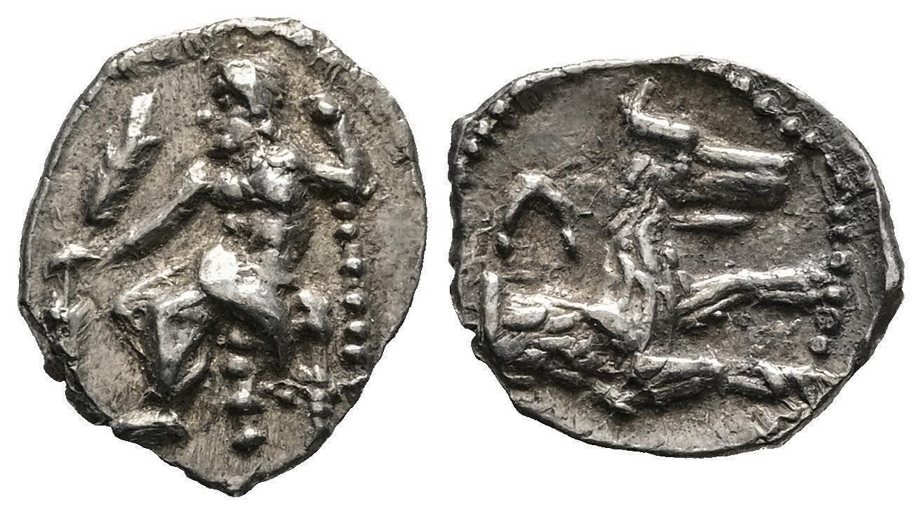 Lykaonia. Laranda. Obol. 324/3 BC. (SNG BnF-443 Cilicia). (Sng Levante-223 Cilicia). (Sng Ashmolean-1923 Cilicia). Anv.: Baaltars seated to left, torso facing, holding grain ear and grape bunch in extended right hand, sceptre in left. Rev.: Forepart of wolf to right, inverted crescent above. Ag. 0,57 g. Choice VF. Est...100,00.