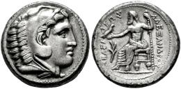 Kingdom of Macedon. Philip III Arrhidaios. Tetradrachm. 323-317 BC. Amphipolis. In the name and types of Alexander III of Macedon. (Price-117). (Troxell-Studies, Issue J3). Anv.: Head of Herakles right, wearing lion skin. Rev.: Zeus seated left on throne, holding eagle and sceptre. Control: Laurel branch in left field; BAΣIΛEΩΣ to the left , AΛEΞANΔPOY to the right. Ag. 16,54 g. Struck under Polyperchon. A good sample. XF/Almost XF. Est...1200,00.