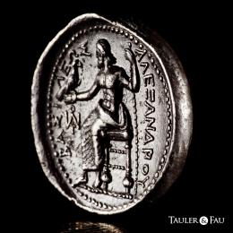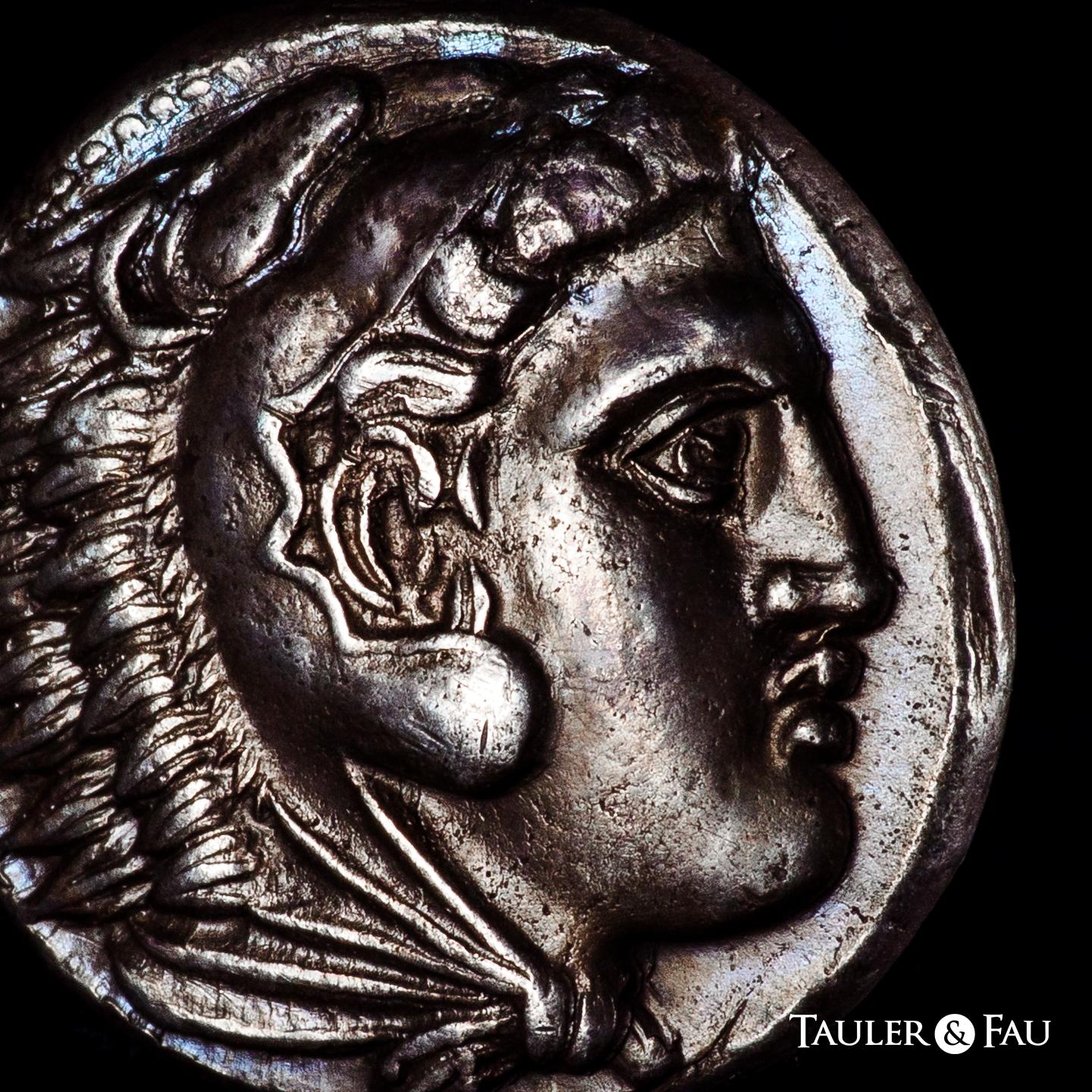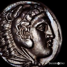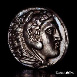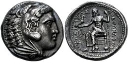 Kingdom of Macedon. Alexander III, "The Great". Tetradrachm. 322-320 BC. Posthumous issue of Amphipolis, by Philip III Arrhidaeus, under Antipater. (Price-110). (Hgc). Anv.: Head of Heracles right, wearing lion skin headdress. Rev.: BAΣIΛEΩΣ ΑΛΕΞΑΝΔΡΟΥ. Zeus seated left , holding long scepter in his left hand and eagle with closed wings in right; to left, monogram. Ag. 17,07 g. Beautiful patina. Attractive specimen. XF. Est...1000,00.