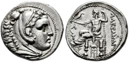 Kingdom of Macedon. Kassander as regent. Tetradrachm. 310-294 BC. Amphipolis. In the name and types of Alexander III of Macedon. (Price-461). (Müller-59). (Ehrhardt-25). Anv.: Head of Herakles to right, wearing lion skin headdress. Rev.: Zeus Aëtophoros seated to left, holding sceptre; AΛEΞANΔPOY to right, Λ above torch in left field, tripod below throne. Ag. 17,11 g. A good sample. Scarce in this grade. XF. Est...900,00.