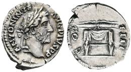 Antoninus Pius. Denarius. 145-161 AD. Rome. (Ric-III 137). (Bmcre-536). (Rsc-345). Anv.: ANTONINVS AVG PIVS P P, laureate head to right. Rev.: COS IIII, pulvinar (throne) of Jupiter and Juno: a square seat, draped and surmounted by horizontal winged thunderbolt. Ag. 3,37 g. XF. Est...140,00.