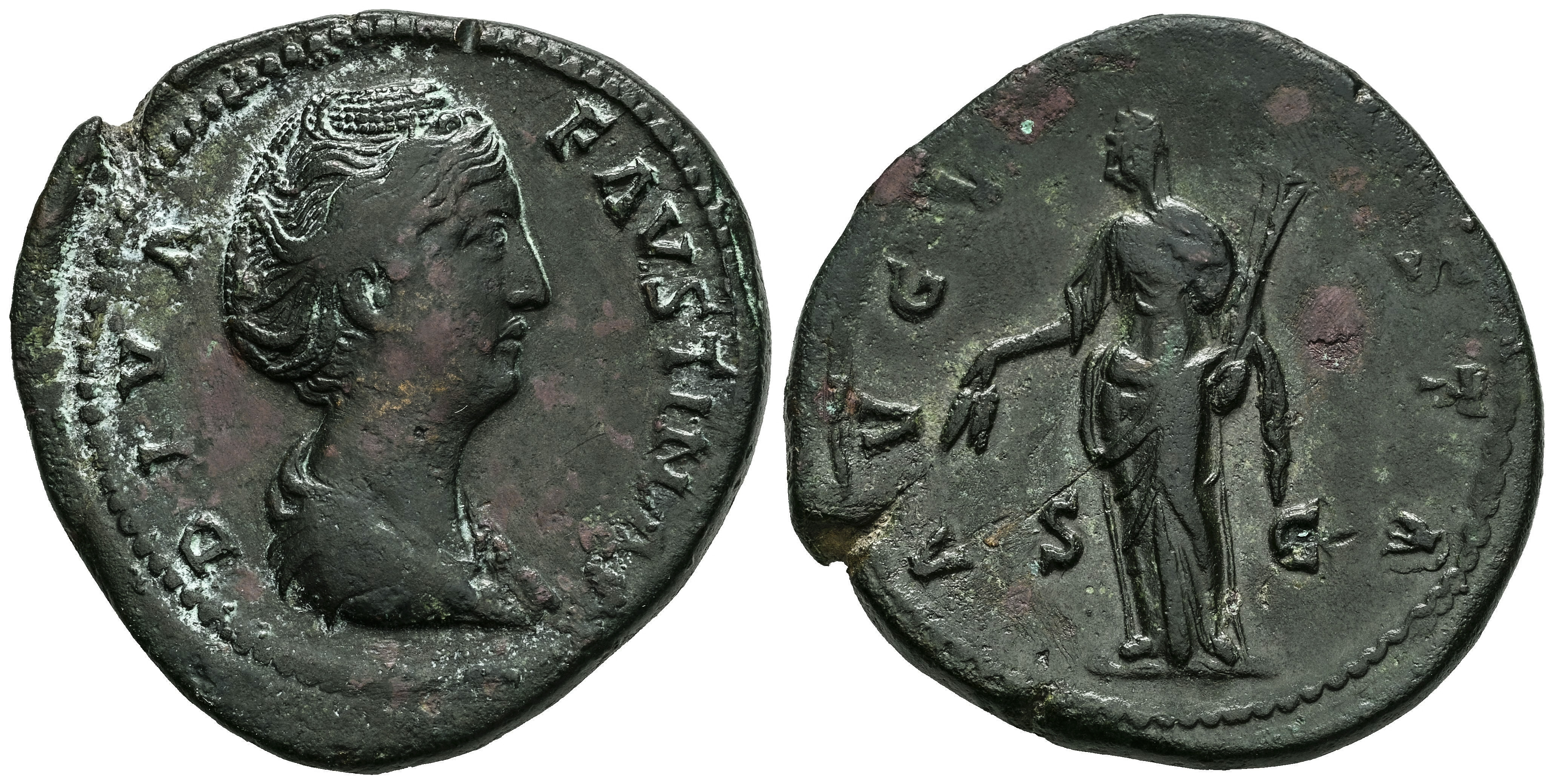 Diva Faustina. Sestertius. 146-161 AD. Rome. (Ric-1116). (Bmcre-1509). (C-79). Anv.: DIVA FAVSTINA. Draped bust of to right. Rev.: AVGVSTA. Ceres standing front, head to left, holding grain ears in her right hand and torch in her left; S-C across fields. Ae. 28,21 g. Ex J. Vico 125 (03/03/2011), lot 3257. Included original label. Choice VF. Est...120,00.
