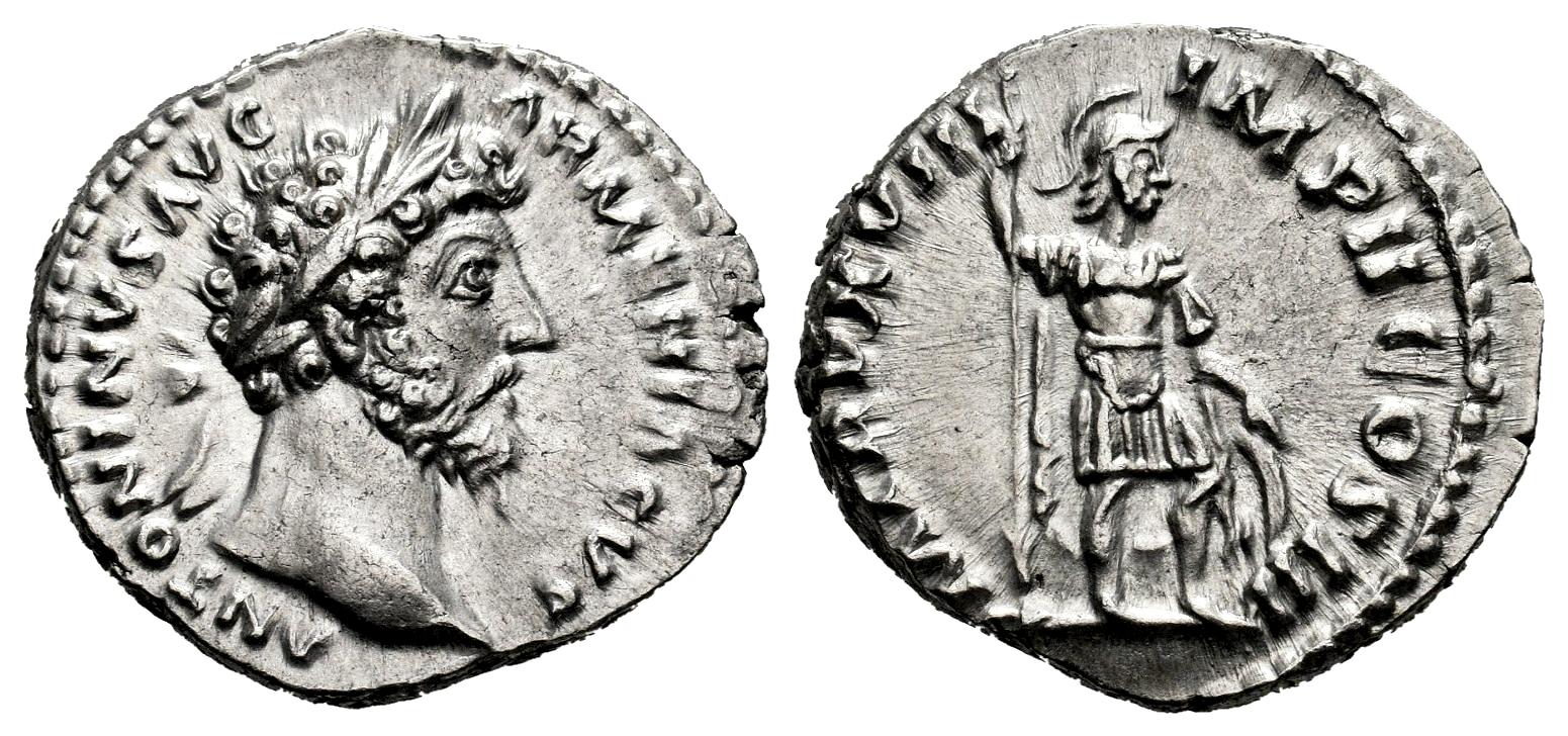 Marcus Aurelius. Denarius. 163-164 AD. Rome. (Ric-92). (C-469). Anv.: ANTONINVS AVG ARMENIACVS, laureate head right. Rev.: P M TR P XVIII IMP II COS III, Mars standing right, holding spear and resting left hand on shield. Ag. 3,52 g. Ex Áureo & Calicó 224/2 (29/04/2010), lot 2309. XF. Est...200,00.