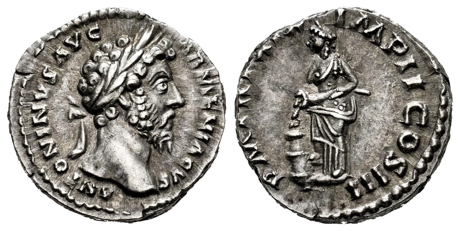 Marcus Aurelius. Denarius. 164-165 AD. Rome. (Ric-III 125). (Bmcre-359). (Rsc-473). Anv.: ANTONINVS AVG ARMENIACVS, laureate head to right. Rev.: P M TR P XIX IMP II COS III, Annona standing to left, emptying cornucopiae into modius, foot on globe. Ag. 3,33 g. Ex Classical Numismatic Group 238 (11/08/2010), lot 440. XF. Est...200,00.