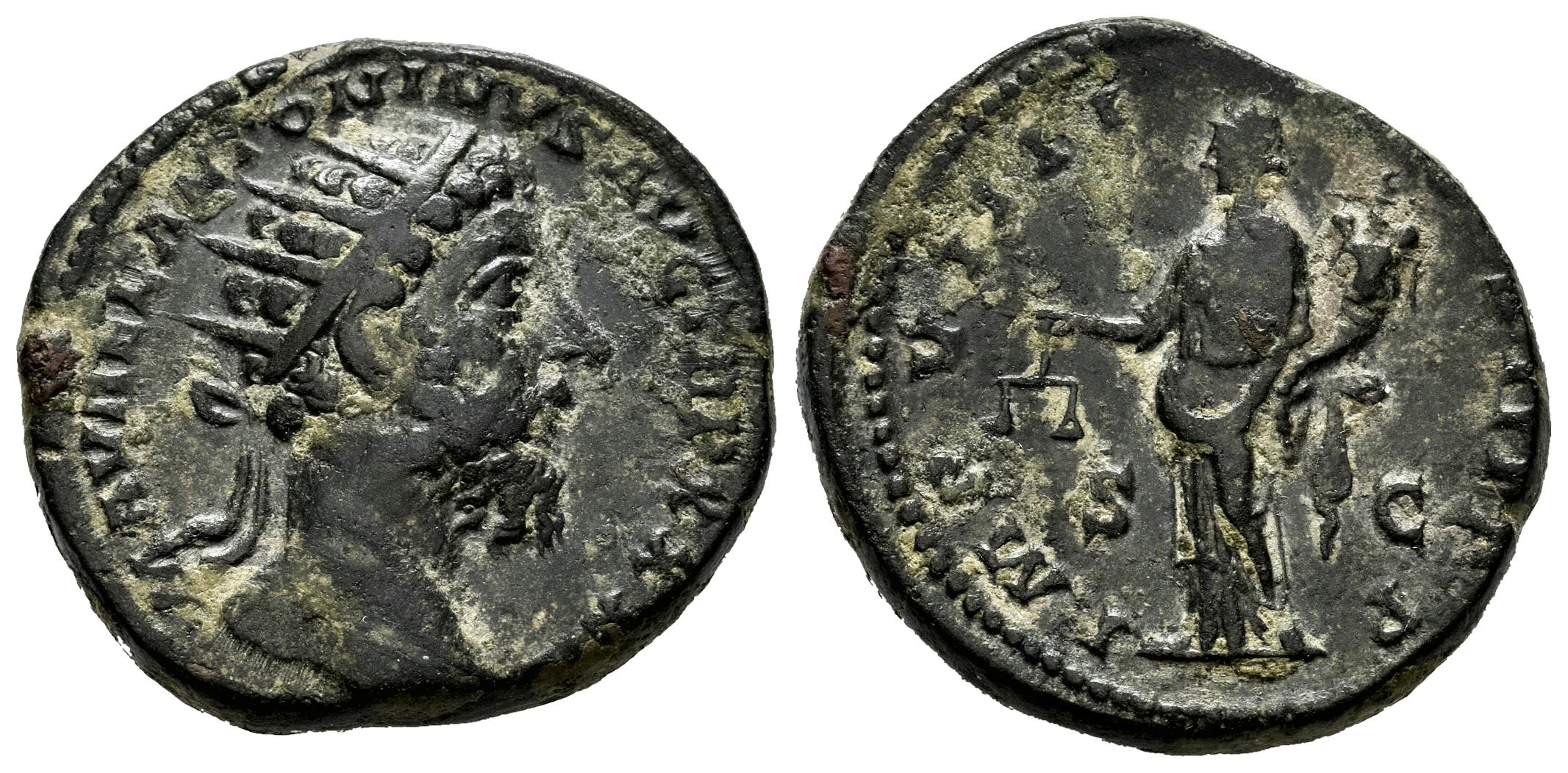 Marcus Aurelius. Dupondius. 178 AD. Rome. (Ric-III 1232). (Bmcre-1682). Anv.: M AVREL ANTONINVS AVG TR P XXX(II), radiate head to right. Rev.: IMP VIIII (COS) III P P, Aequitas, draped and diademed, standing to left holding scales and cornucopiae; S-C across fields. Ae. 13,93 g. VF. Est...60,00.