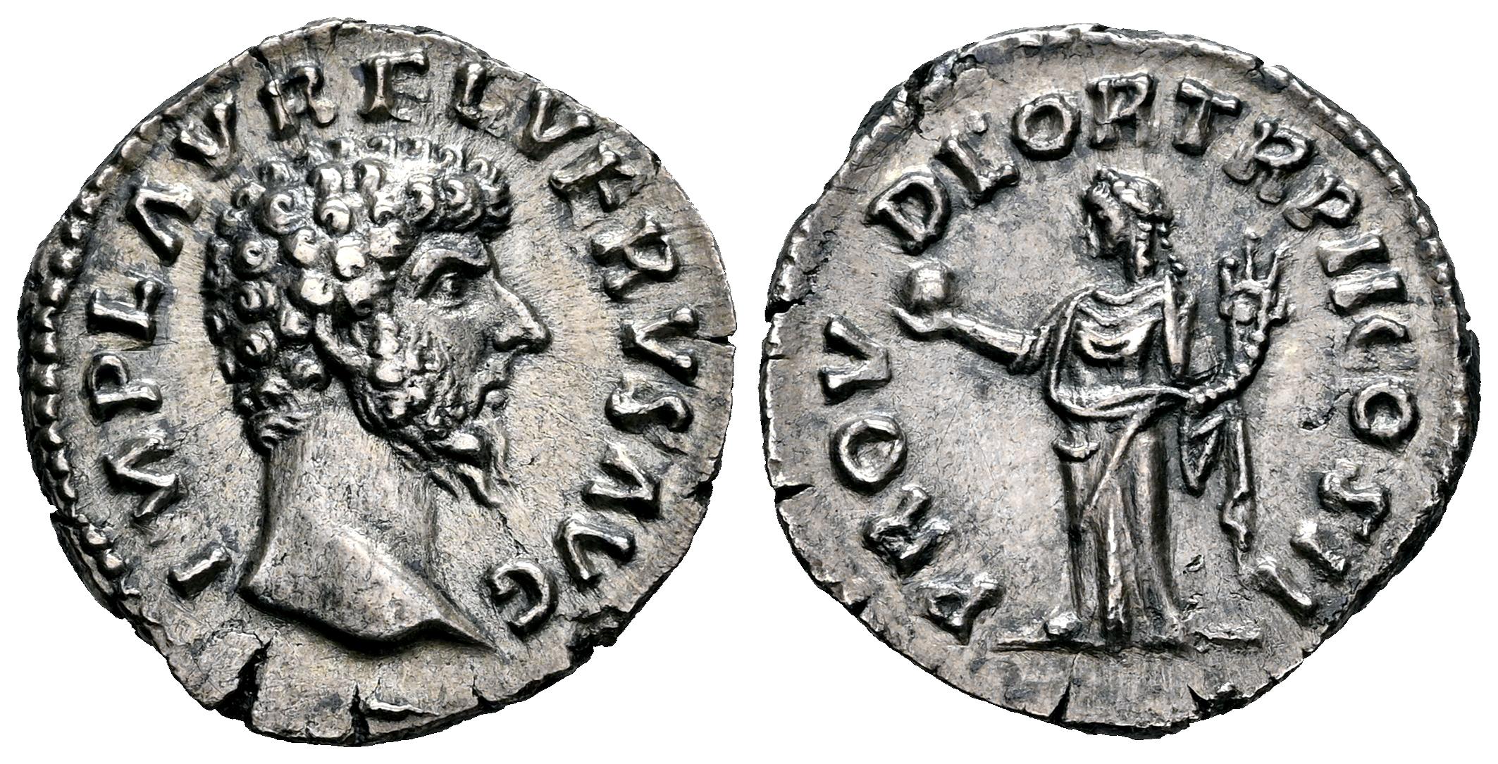 Lucius Verus. Denarius. 161 AD. Rome. (Ric-III 463). (Bmcre-35). (Rsc-144). Anv.: IMP L AVREL VERVS AVG, bare head to right . Rev.: PROV DEOR TR P COS II, Providentia standing facing, head to left, holding globe and cornucopiae. Ag. 2,78 g. Attractive specimen. Delicate patina. Ex Varesi 70 (19/04/2017), lot 108. Included original label. XF. Est...200,00.