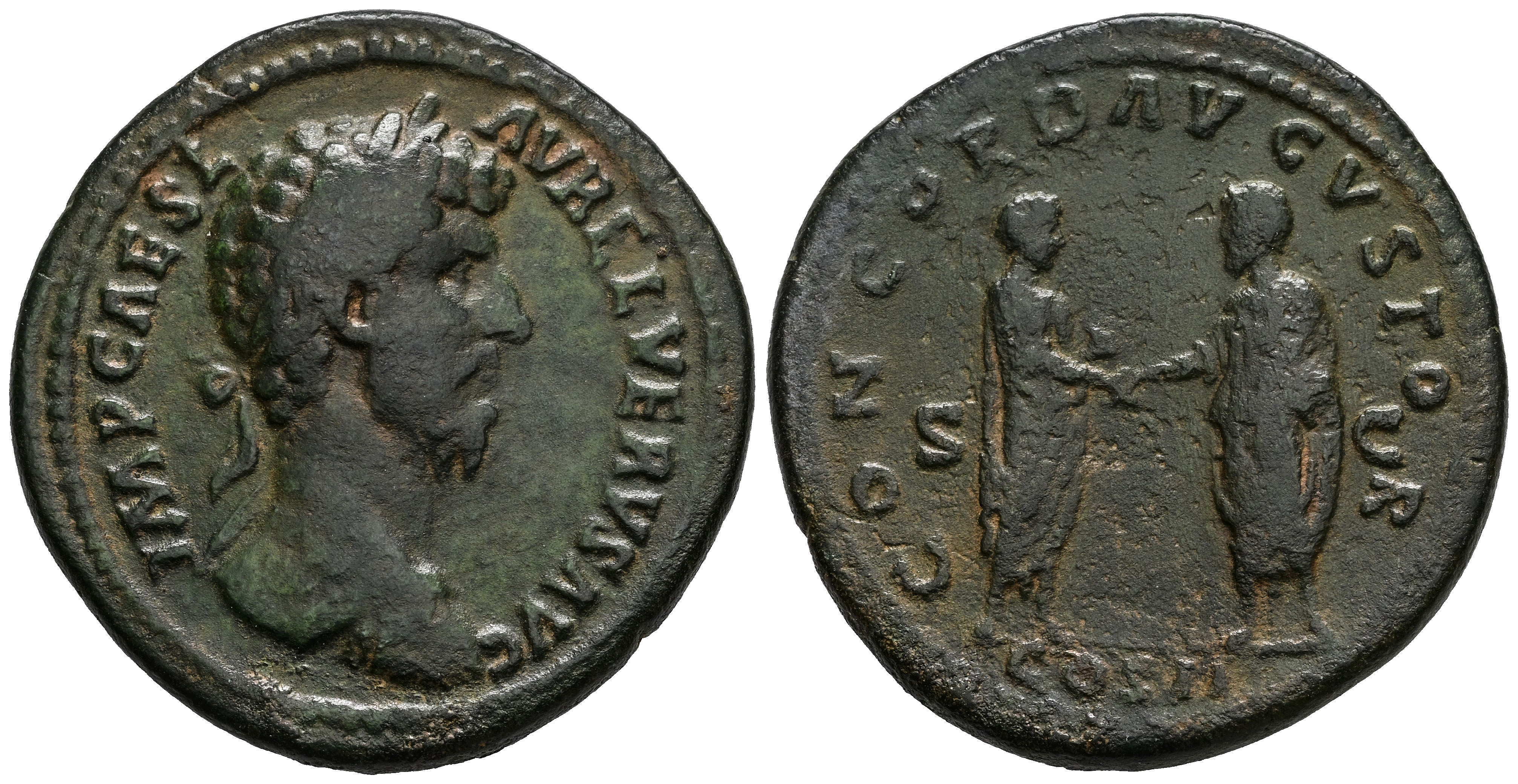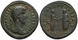 Lucius Verus. Sestertius. 161 AD. Rome. (Ric-1308). Anv.: IMP CAES L AVREL VERVS AVG, bare-headed right. Rev.: CONCORD AVGVSTOR, M. Aurelius and L. Verus, both togate, standing facing each other and clasping right hands; S-C across fields, COS II in exergue. Ae. 12,94 g. Tooled and smoothed. VF. Est...400,00.
