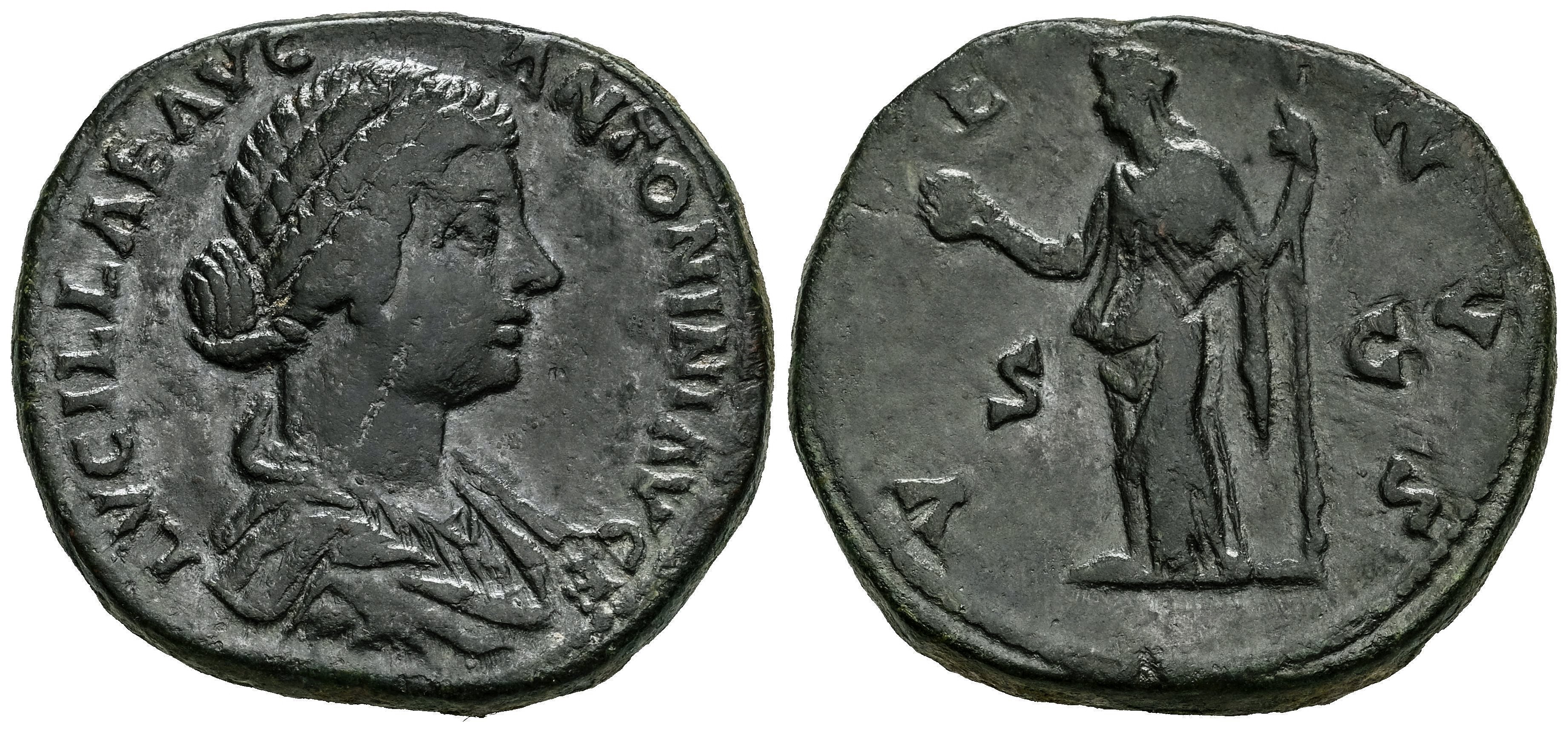 Lucilla. Sestertius. 161-169 AD. Rome. (Ric-III Addenda, p. 354). (Bmcre-1167). Anv.: LVCILLAE AVG ANTONINI AVG F, draped bust to right. Rev.: VENVS, Venus standing facing, head to left, holding apple and sceptre; S-C across fields. Ae. 23,28 g. Hairline on obverse. VF. Est...120,00.