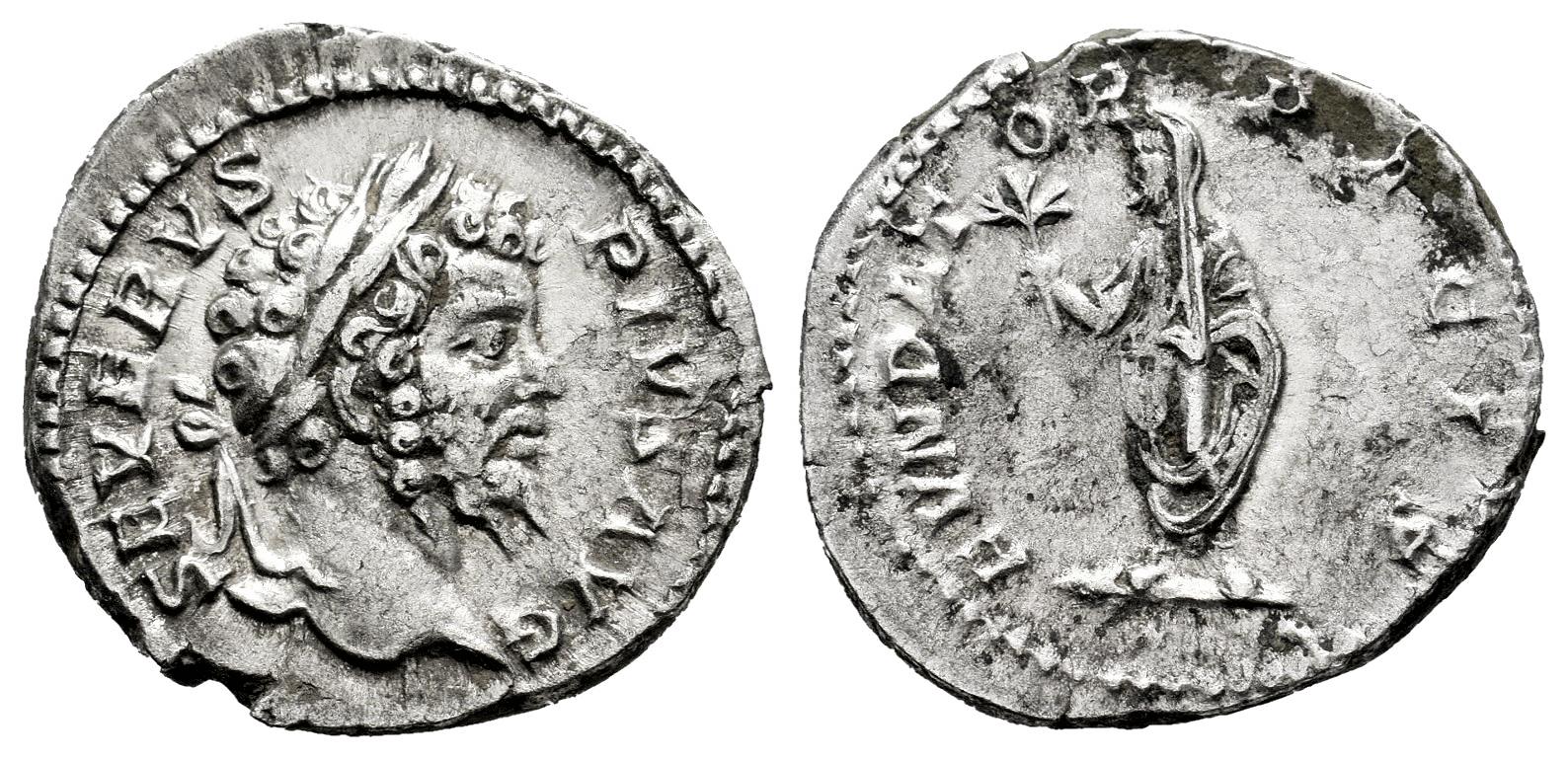 Septimius Severus. Denarius. 202-210 AD. Rome. (Ric-IV 265). (Bmcre-330). (Rsc-205). Anv.: SEVERVS PIVS AVG, laureate head to right. Rev.: FVNDATOR PACIS, emperor, veiled and togate, standing to left, holding branch and roll. Ag. 2,96 g. Choice VF. Est...75,00.