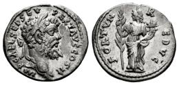 Septimius Severus. Denarius. 194-195 AD. Emesa. (Ric-383). (Bmcre-357). Anv.: IMP CAE L SEP SEV PERT AVG COS II Laureate head to right. Rev.: FORTVN REDVC Fortuna standing front, head to left, holding long palm with her right hand and cornucopiae with her left. Ag. 2,85 g. Ex Fritz Rudolf Künker eLive 16 (21/03/2010). Choice VF. Est...100,00.