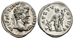 Septimius Severus. Denarius. 197 AD. Laodicea. (Ric-493). (Bmc-464). Anv.: (L) SEPT SEV PERT AVG IMP VIIII. Laureate head of Septimius Severus to right. Rev.: P M TR P V COS II P P.Fortuna standing front, head to left, holding rudder set on globe in her right hand and cornucopiae in her left. Ag. 2,79 g. Small planchet flaw on obverse. Almost XF. Est...80,00.