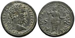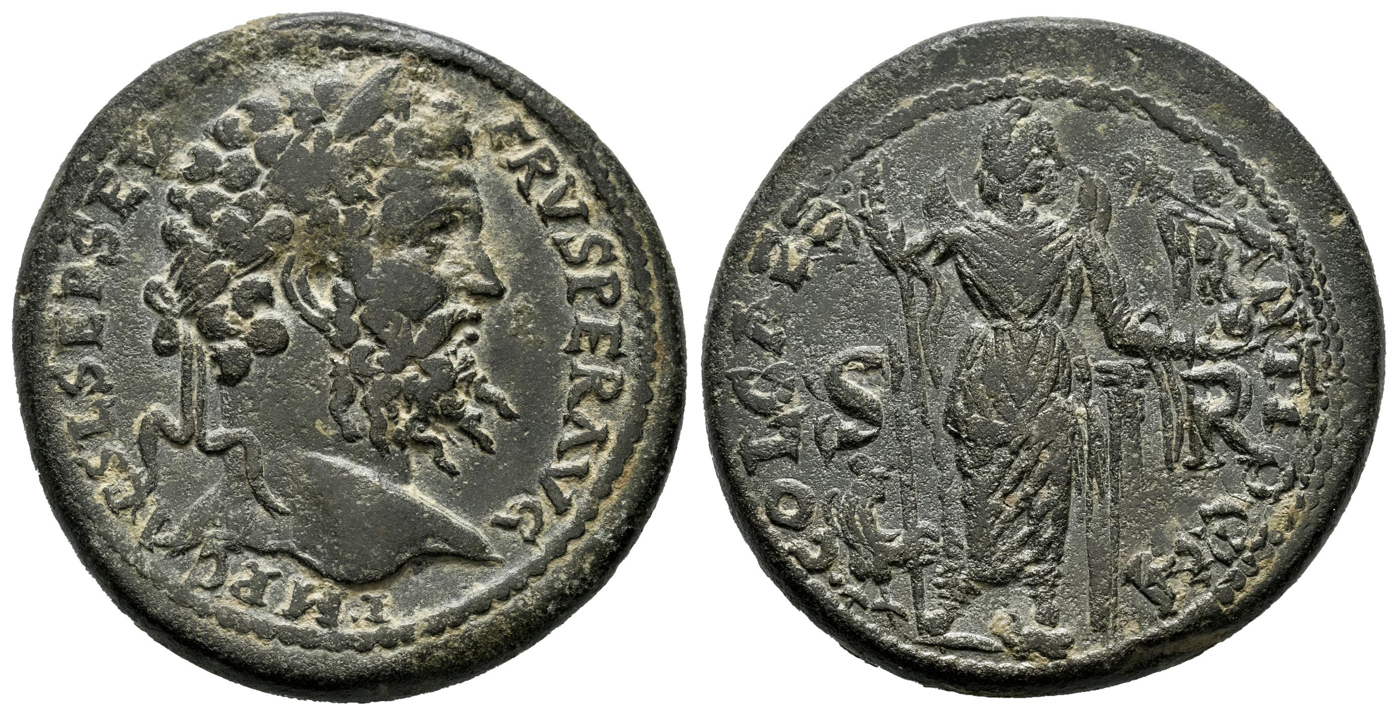Septimius Severus. AE 33. 193-211 AD. Antioch. Pisidia. (SNG BnF-1100/5). (Sng Cop-27). (Sng von Aulock-4924). Anv.: I•MP CAES L SEP SEVERVS PER AVG, laureate head to right. Rev.: COL CAES ANTIOCH, Mên standing facing, head to right, holding sceptre and Nike on globe, cockerel at his feet to left; S-R across fields. Ae. 25,46 g. Light double strike on reverse. Choice VF/VF. Est...100,00.