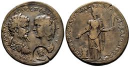 Septimius Severus, with Julia Domna. AE 37. 193-211 AD. Caria, Stratonicaea. Flavius Leon, son of Alcaios, prytanis. (RPC-V 2 Online 73620). (SNG Leypold-845). Anv.: ·AY·KAI·ΛOY·CEΠ CEY·HPOC·IOY·ΔOMNA. Laureate, draped, and cuirassed bust of Septimius, seen from behind vis-à-vis draped bust of Domna. Rev.: EΠI ΠPY ΛEONTOC TOY AΛKEOY CTPATONIKEΩN. Hecate standing facing, head left, wearing kalathos, holding patera and torch; at feet left, lighted altar. Ae. 25,11 g. Countermark: Laureate bust to right within circular incuse. VF. Est...600,00.