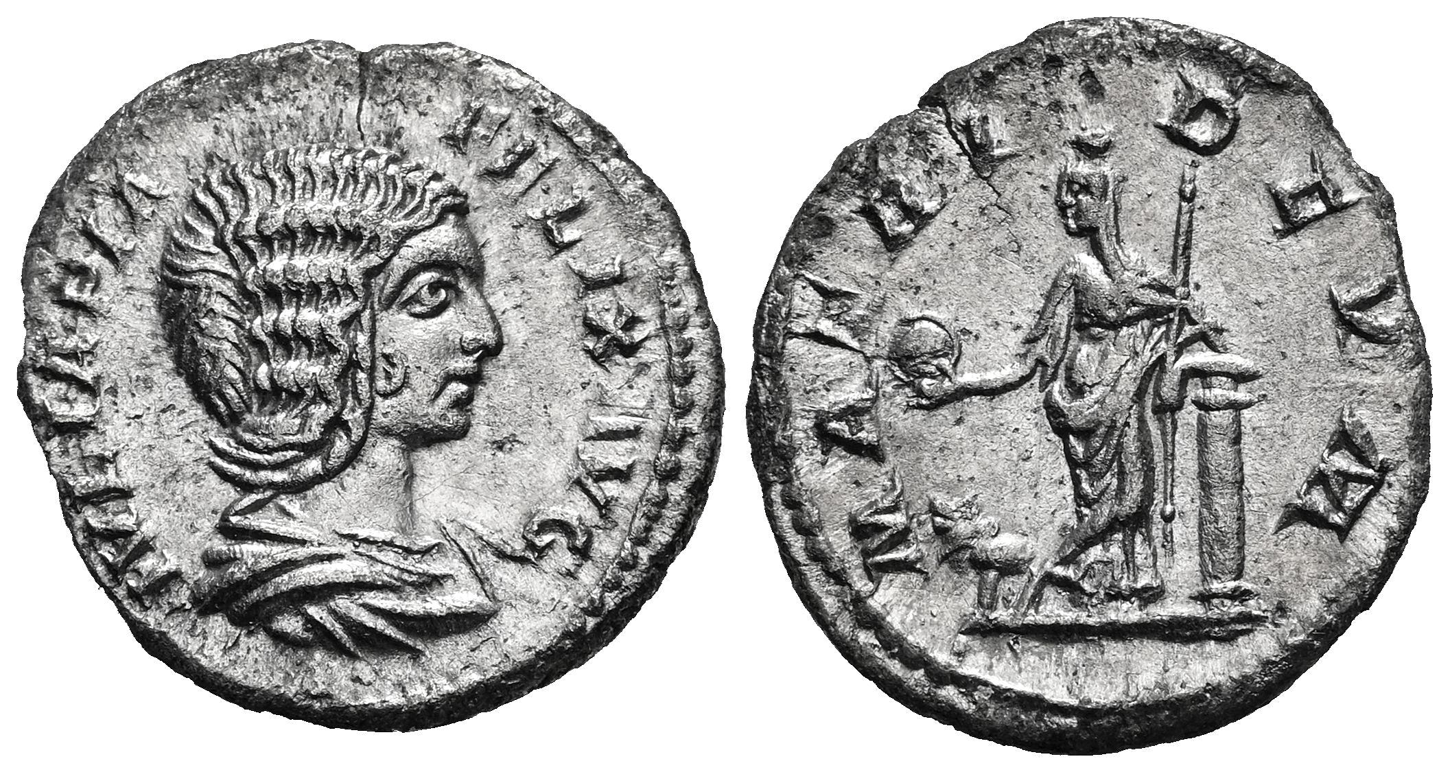 Julia Domna. Denarius. 211-217 AD. Rome. (Ric-IV 382). (Bmcre-14/18). (Rsc-137). Anv.: IVLIA PIA FELIX AVG, draped bust to right. Rev.: MATRI DEVM, Cybele standing facing, head to left, holding drum and sceptre, leaning on column; at feet, lion to left. Ag. 1,23 g. Choice VF. Est...90,00.