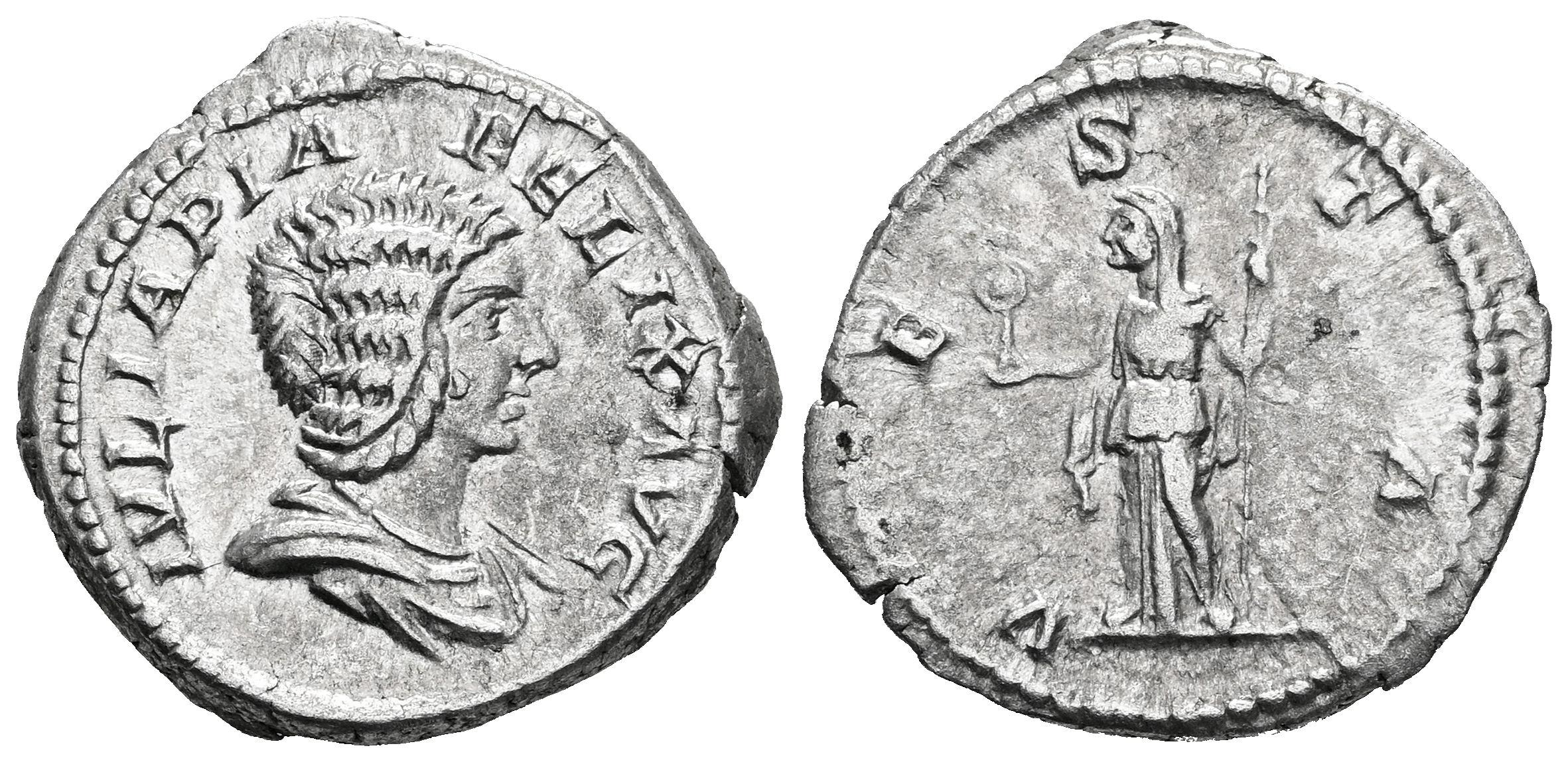 Julia Domna. Denarius. 211-217 AD. Rome. (Ric-IV 390). (Bmcre-29). (Rsc-230). Anv.: IVLIA PIA FELIX AVG, draped bust to right. Rev.: VESTA, Vesta standing facing, head to left, holding palladium and sceptre. Ag. 3,62 g. Choice VF/VF. Est...100,00.