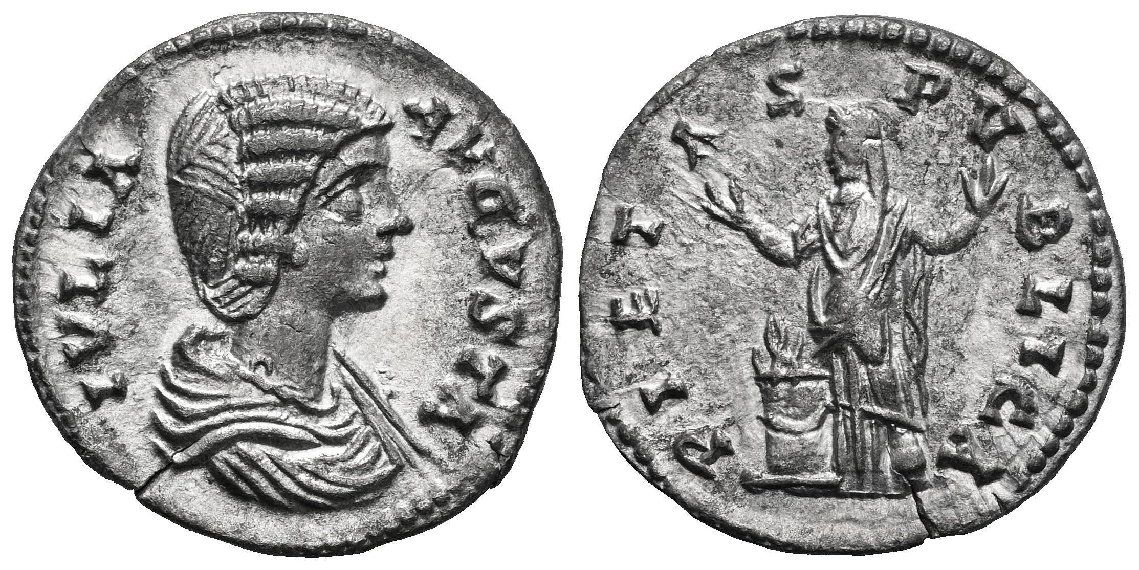 Julia Domna. Denarius. 198-202 AD. Laodicea ad Mare. (Ric-643). (Bmcre-612). (C-156). Anv.: IVLIA AVGVSTA. Draped bust to right. Rev.: PIETAS PVBLICA. Veiled Pietas standing front, head to left, raising both hands in prayer; to left, lighted and garlanded altar. Ag. 2,63 g. Minor crack. Almost XF/Choice VF. Est...90,00.