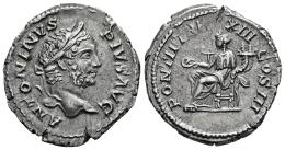 Caracalla. Denarius. 210 AD. Rome. (Ric-116a). (Bmcre-29). (Rsc-484). Anv.: ANTONINVS PIVS AVG, laureate head to right. Rev.: PONTIF TR P XIII COS III, Concordia seated to left, holding patera and double cornucopiae. Ag. 3,10 g. Delicate patina. Almost XF/Choice VF. Est...120,00.