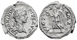 Caracalla. Denarius. 201-206 AD. Rome. (Ric-IV 144b). (Bmcre-296). (Rsc-660). Anv.: ANTONINVS PIVS AVG, laureate, draped and cuirassed bust to right. Rev.: VICT PART MAX, Victory advancing to left, holding palm and wreath. Ag. 3,01 g. VF/VF. Est...80,00.