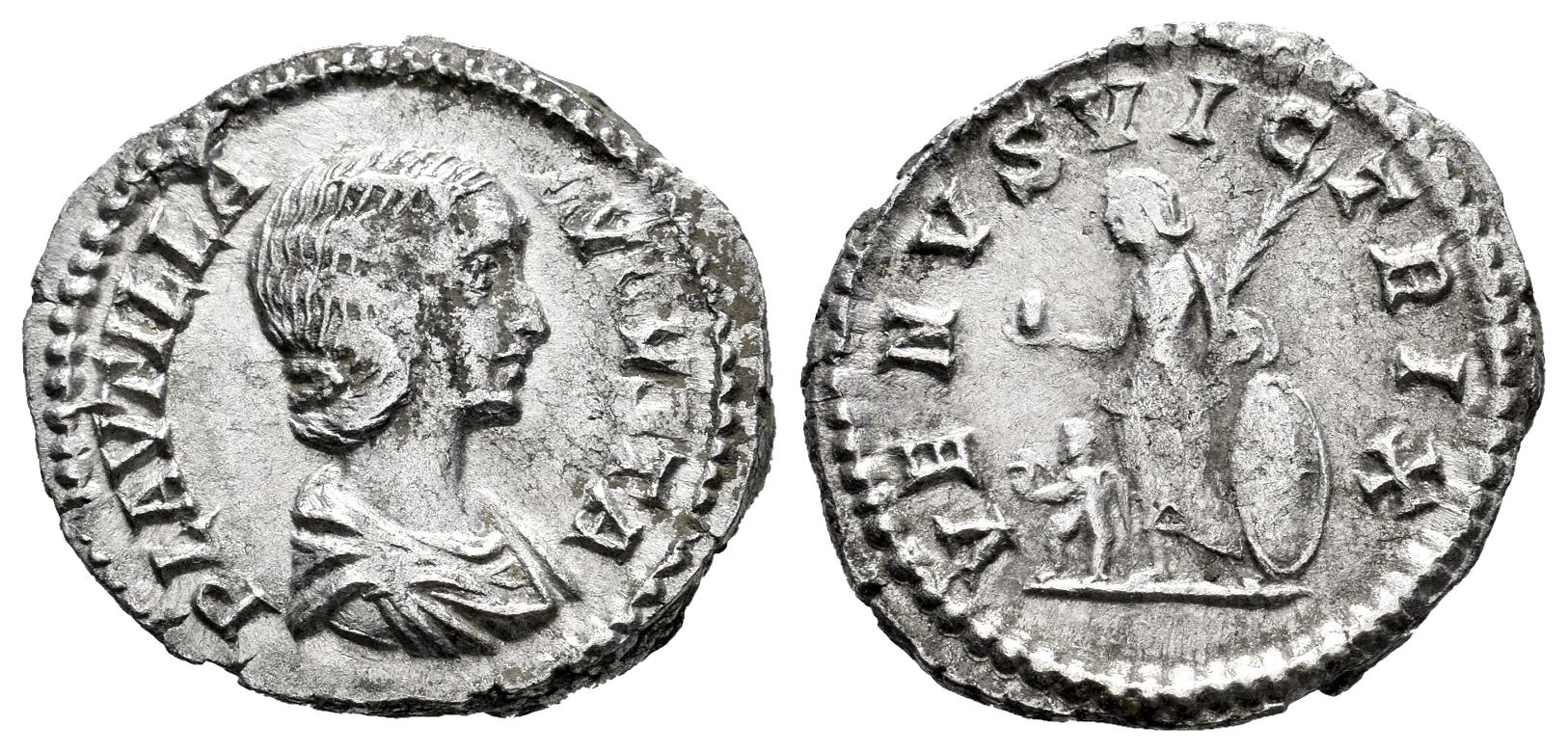 Plautilla. Denarius. 202-205 AD. Rome. (Ric-IV 369). (Bmcre-429). (Rsc-25). Anv.: PLAVTILLA AVGVSTA, draped bust to right. Rev.: VENVS VICTRIX, Venus standing facing, head to left, holding apple and palm, resting elbow on shield; Cupid at feet on left. Ag. 2,61 g. Choice VF. Est...100,00.