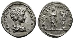 Geta. Denarius. 200-202 AD. Rome. (Ric-IV 18). (Bmcre-234). (Rsc-157b). Anv.: P SEPT GETA CAES PONT, bare-headed and draped bust to right. Rev.: PRINC IVVENTVTIS, prince standing to left, holding branch and spear; trophy behind. Ag. 3,55 g. Slight patina. Ex H.D. Rauch 7 e-Live (19/03/2010), lot 203. Choice VF. Est...90,00.