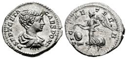 Geta. Denarius. 200-202 AD. Rome. (Ric-IV 23). (Bmcre-723). (Rsc-206). Anv.: P SEPT GETA CAES PONT, bare-headed, draped and cuirassed bust to right. Rev.: VICT AETERN, Victory flying to left, holding wreath over shield below. Ag. 3,59 g. A good sample. Traces of luster. Ex H.D. Rauch 85 (26/11/2009), lot 677. AU/XF. Est...140,00.