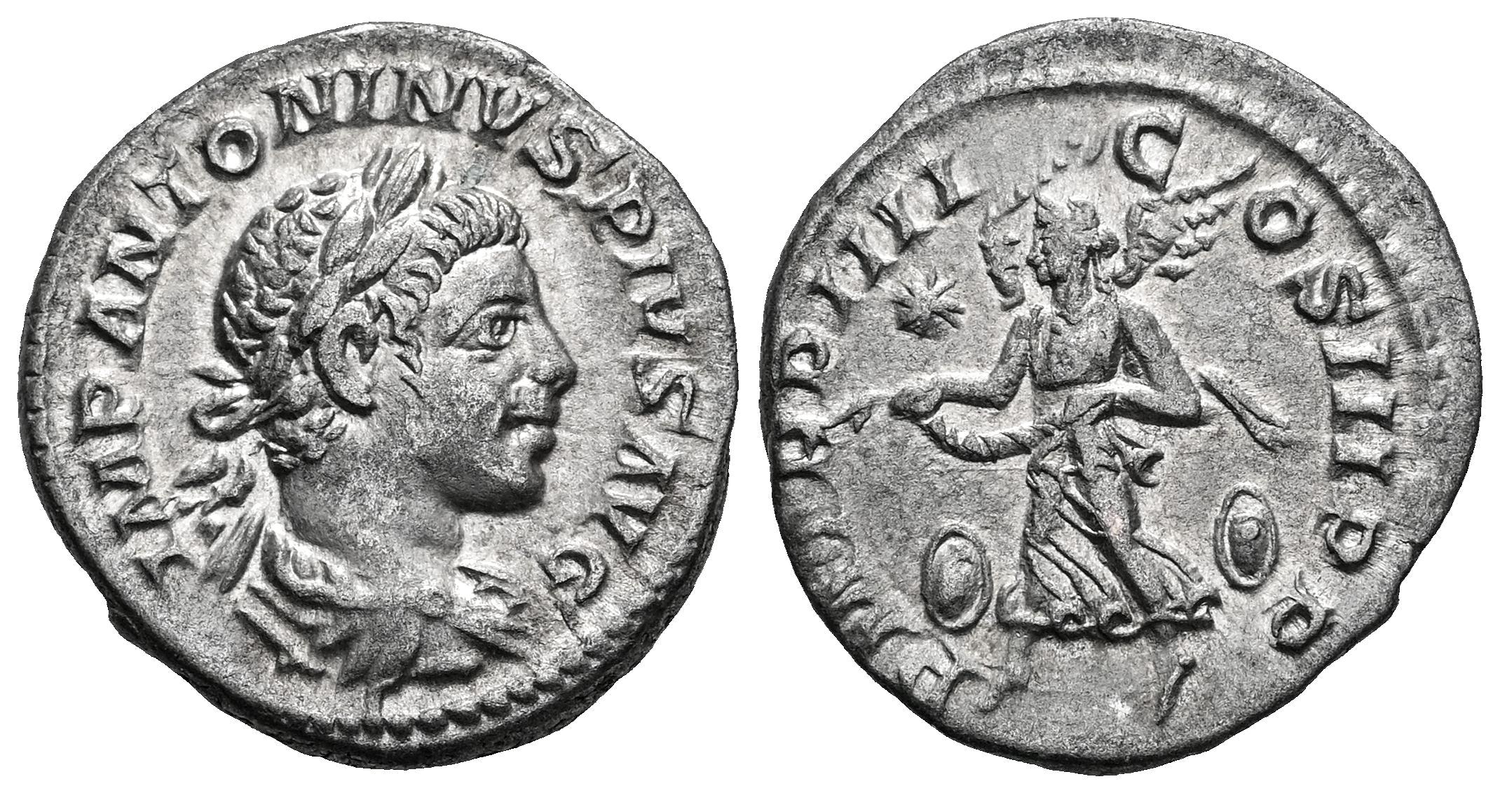 Elagabalus. Denarius. 220-221 AD. Rome. (Ric-IV 45). (Bmcre-253). (Rsc-194). Anv.: IMP ANTONINVS PIVS AVG, laureate, draped and cuirassed bust to right. Rev.: P M TR P IIII COS III P P, Victory flying to left, holding open wreath, small shield to left and right; star in left field. Ag. 3,14 g. Choice VF. Est...90,00.