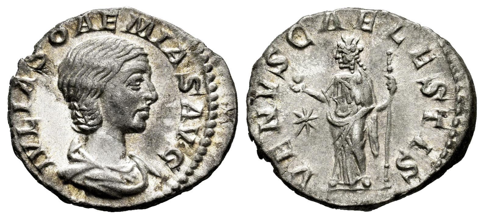 Julia Soaemias. Denarius. 220-222 AD. Rome. (Ric-241). (Bmcre-46). (C-8). Anv.: IVLIA SOAEMIAS AVG Draped bust to right. Rev.: VENVS CAELESTIS Venus standing front, head to left, holding apple in her right hand and scepter in her left; in field to left, star. Ag. 2,93 g. Delicate patina with Original underlying luster. Attractive. Ex Vauctions (13/05/2010). Almost XF. Est...140,00.