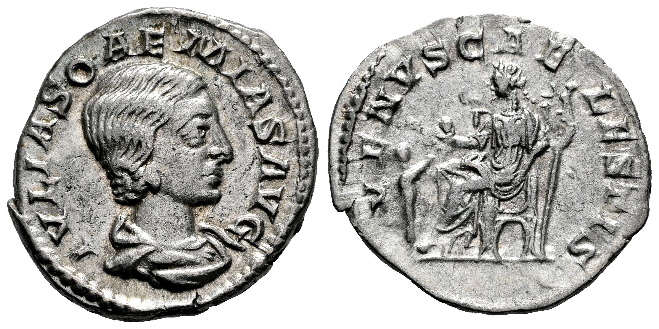 Julia Soaemias. Denarius. 218-222 AD. Antioch. (Ric-243). (Bmcre-55). (Rsc-14). Anv.: IVLIA SOEMIAS AVG, draped bust right. Rev.: VENVS CAELESTIS, Venus seated left, holding apple and sceptre; at left, child reaches up to her. Ag. 2,81 g. Choice VF. Est...80,00.