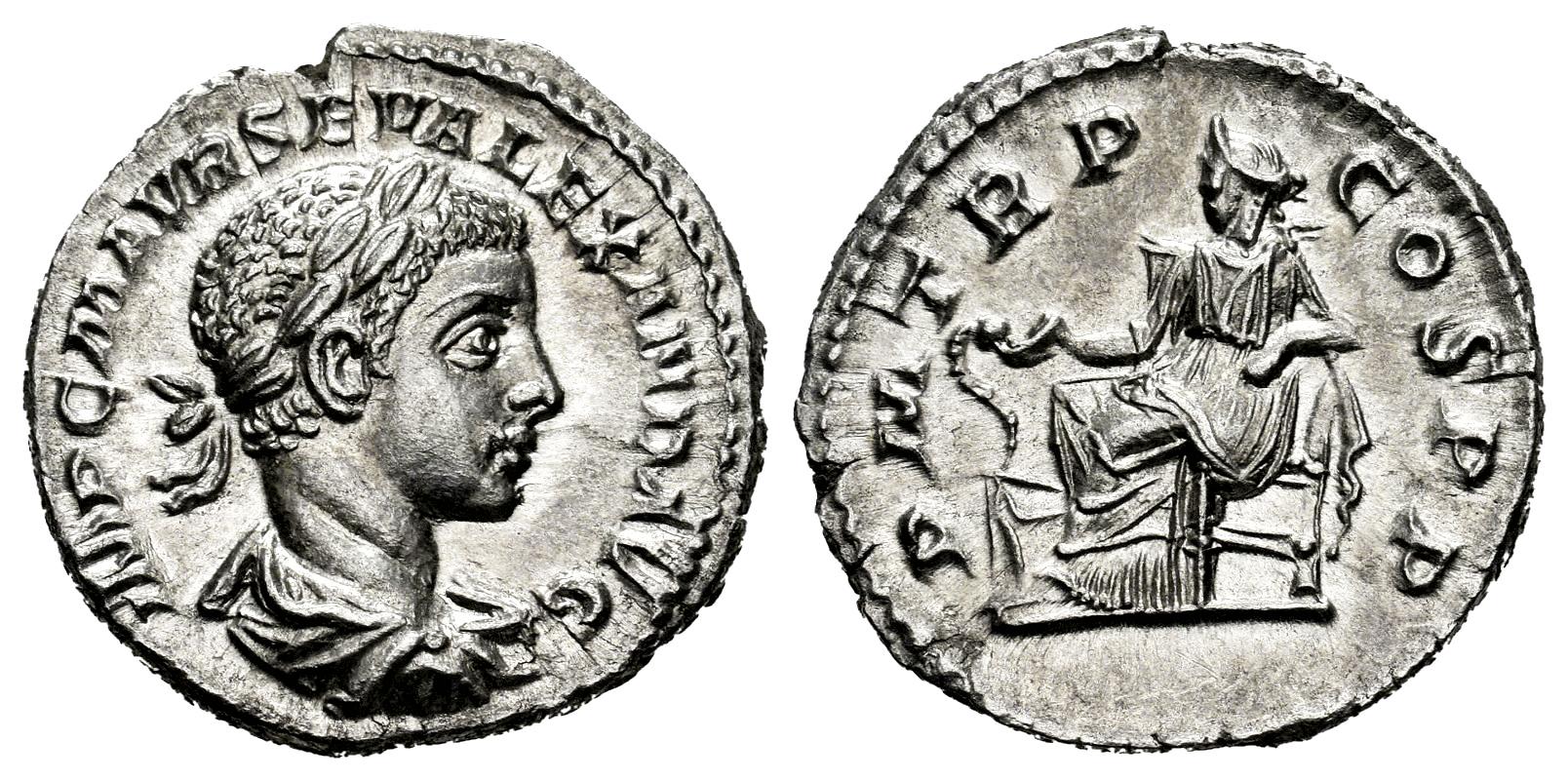 Severus Alexander. Denarius. 222 AD. Rome. (Ric-IV 14). (Bmcre-33). (Rsc-218a). Anv.: IMP C M AVR SEV ALEXAND AVG, laureate, draped and cuirassed bust to right. Rev.: P M TR P COS P P, Salus seated to left, feeding out of patera snake coiled round altar and resting elbow on chair. Ag. 3,49 g. Gorgeous specimen. Original luster. Ex CNG Coin shop 870929. AU. Est...220,00.