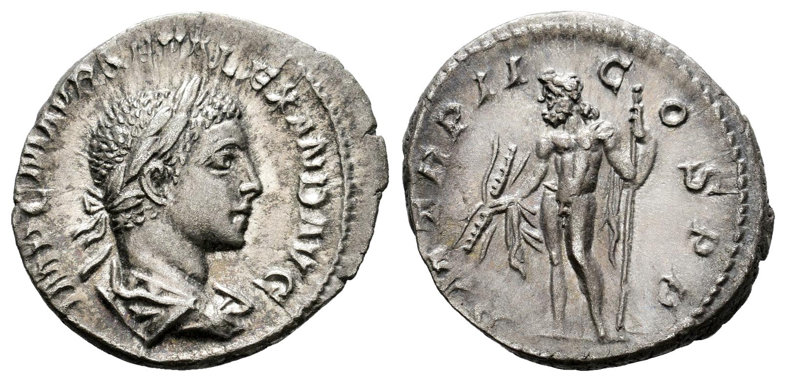 Severus Alexander. Denarius. 223 AD. Rome. (Ric-IV 23). (Bmcre-92). (Rsc-231). Anv.: IMP C M AVR SEV ALEXAND AVG. Laureate and draped bust to right. Rev.: P M TR P II COS P P.Mars standing to left, holding olive branch and spear. Ag. 2,55 g. Soft tone. Almost XF. Est...90,00.