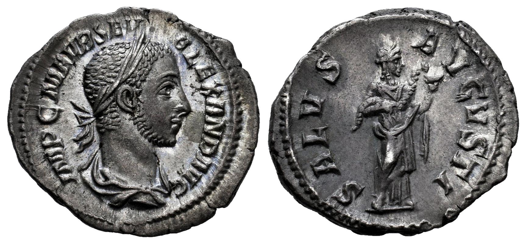 Severus Alexander. Denarius. 233-235 AD. Rome. (Ric-IV 176). Anv.: IMP C MAVR SEV ALEXAND AVG, laureate and draped bust right. Rev.: SALVS AVGVST, Salus standing right, feeding snake which she holds in her arms. Ag. 3,36 g. A good sample. Delicate patina with lightly toned and original underlying luster. Ex Vauctions Sale 241 (04/02/2010), lot 83. Almost MS. Est...180,00.