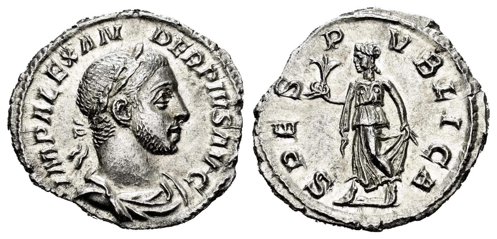 Severus Alexander. Denarius. 231-235 AD. Rome. (Ric-IV 254). (Bmcre-900). (Rsc-546). Anv.: IMP ALEXANDER PIVS AVG, laureate, draped and cuirassed bust to right. Rev.: SPES PVBLICA, Spes walking to left, holding flower and raising skirt. Ag. 2,43 g. Slightly cleaned. Beautiful. XF/Almost MS. Est...140,00.