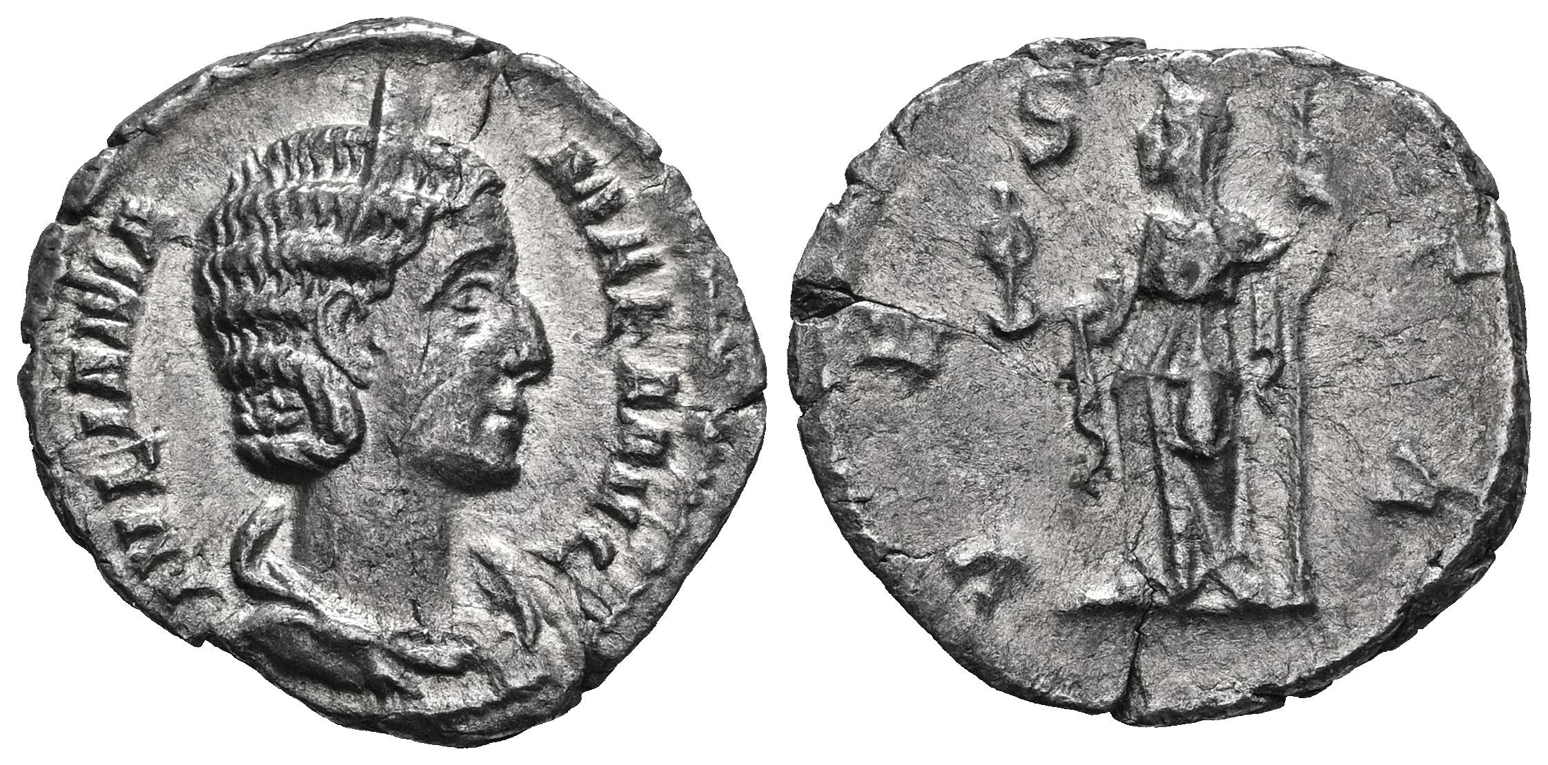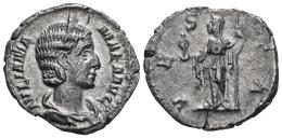 Julia Mamaea. Denarius. 222-235 AD. Rome. (Ric-IV 360). (Bmcre-381). (Rsc-81). Anv.: IVLIA MAMAEA AVG, diademed and draped bust to right. Rev.: VESTA, Vesta standing facing, head to left, holding palladium and sceptre. Ag. 2,60 g. Delicate patina. Minor cracks. Almost XF/Choice VF. Est...100,00.