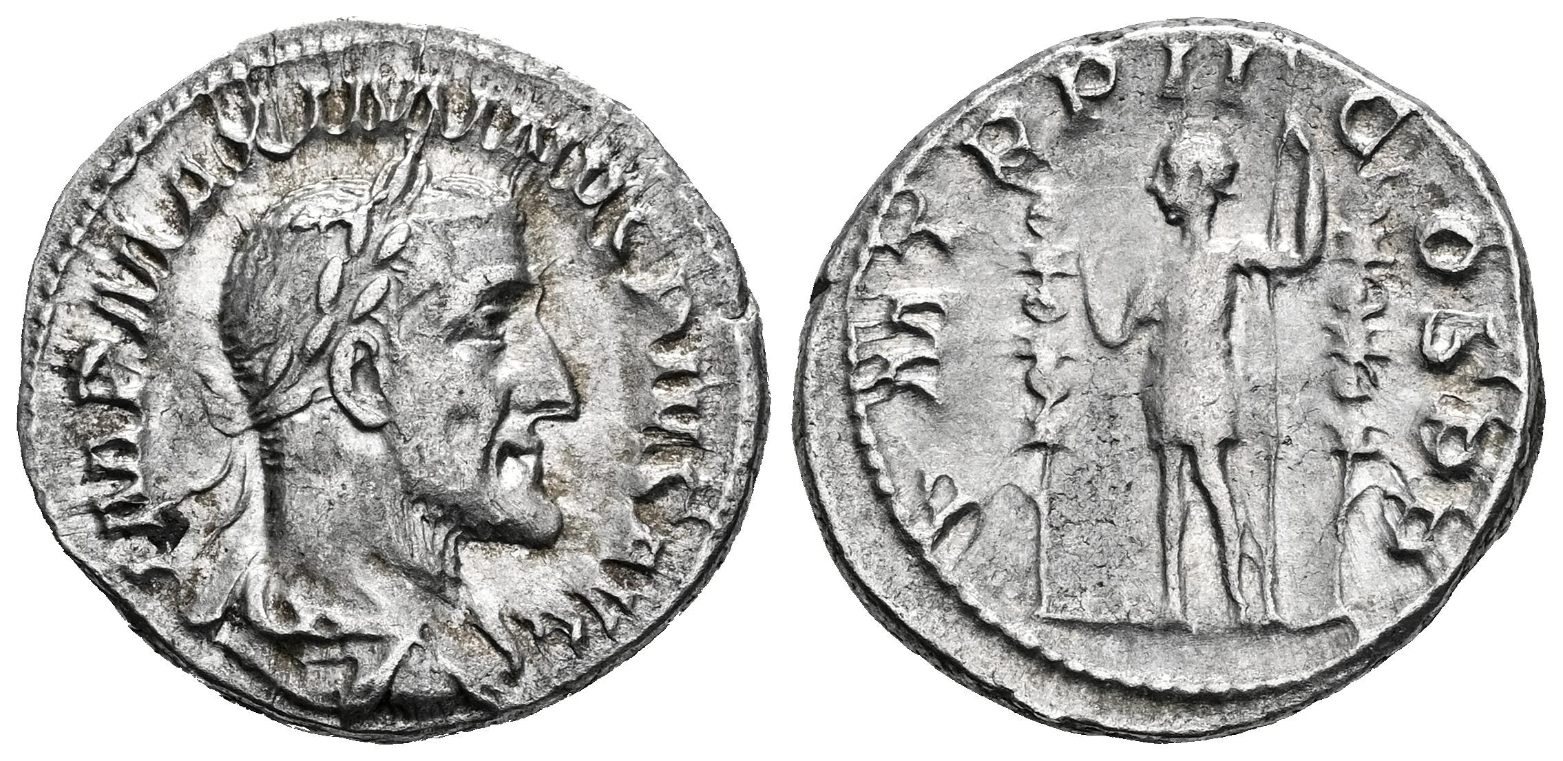 Maximinus I. Denarius. 235-238 AD. Rome. (Ric-IV 4). (Bmcre-157). (Rsc-56). Anv.: MAXIMINVS PIVS AVG GERM, laureate, draped and cuirassed bust to right. Rev.: P M TR P II COS P P, emperor standing to left between two standards, raising hand and holding spear. Ag. 3,37 g. Worn reverse die. Choice VF/VF. Est...90,00.
