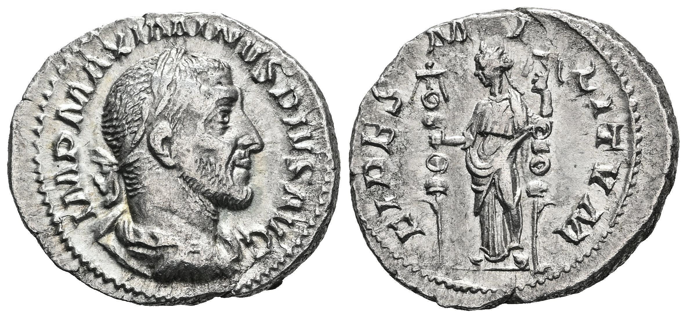 Maximinus I. Denarius. 235-236 AD. Rome. (Ric-IV 7a). (Bmcre-1). (Rsc-7). Anv.: IMP MAXIMINVS PIVS AVG, laureate, draped and cuirassed bust to right. Rev.: FIDES MILITVM, Fides standing facing, head to left, holding military standard in each hand. Ag. 3,42 g. VF. Est...80,00.