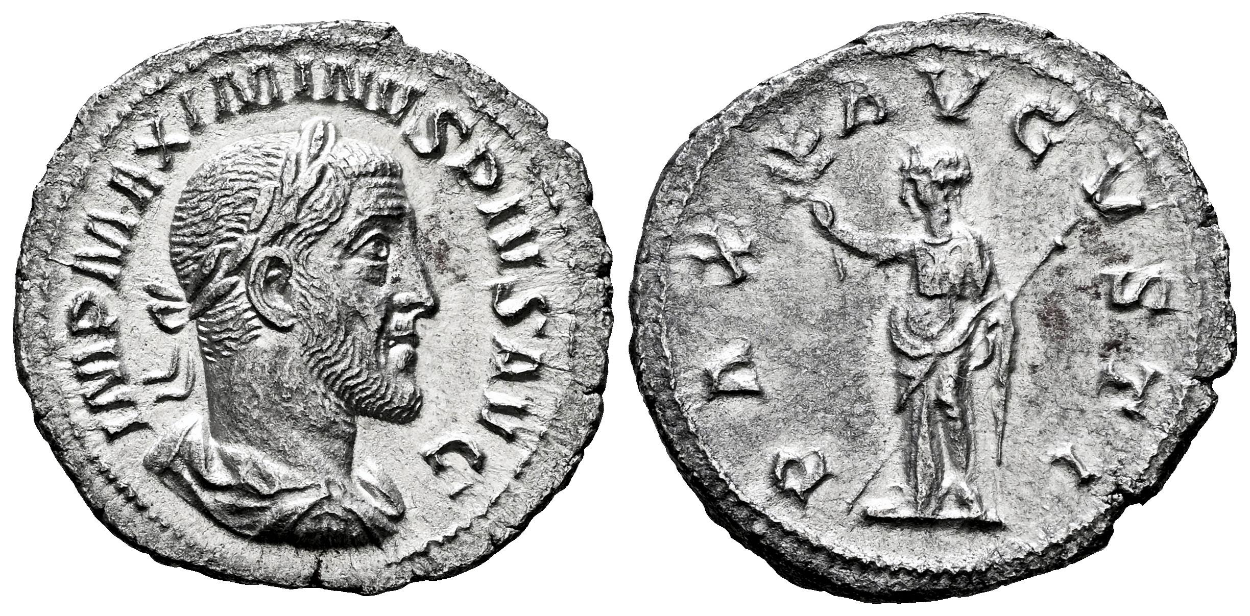 Maximinus I. Denarius. 235-236 AD. Rome. (Ric-IV 12). (Bmcre-68/71). (Rsc-31a). Anv.: IMP MAXIMINVS PIVS AVG. Laureate, draped and cuirassed bust to right. Rev.: PAX AVGVSTI. Pax standing facing, head to left, holding branch in raised hand and transverse sceptre . Ag. 2,87 g. Almost XF/Choice VF. Est...90,00.