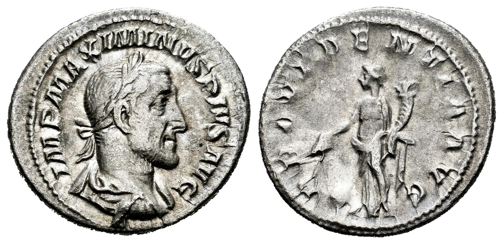 Maximinus I. Denarius. 235-236 AD. Rome. (Ric-IV 13). (Seaby-77a). Anv.: IMP MAXIMINVS PIVS AVG. Laureate and draped bust to right. Rev.: PROVIDENTIA AVG. Providentia standing facing, head to left, holding wand over globe and cornucopiae. Ag. 3,16 g. Choice VF. Est...70,00.