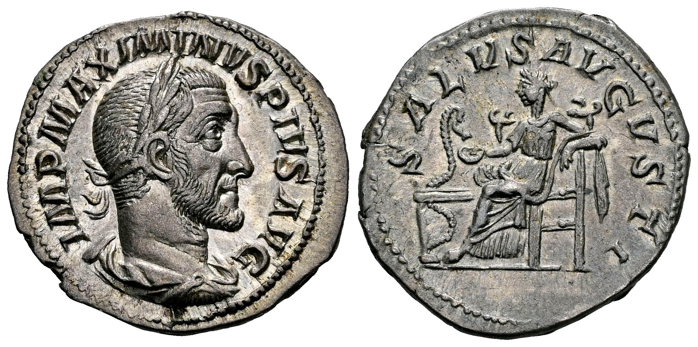Maximinus I. Denarius. 235-236 AD. Rome. (Ric-IV 14). (Bmcre-99). (Rsc-85a). Anv.: IMP MAXIMINVS PIVS AVG, laureate, draped and cuirassed bust to right. Rev.: SALVS AVGVSTI, Salus seated to left, feeding out of patera snake coiled around altar before. Ag. 2,92 g. Attractive specimen. Delicate patina with original underlying luster. Ex Num. Varesi 70 (19/04/2017), lot 140. XF. Est...200,00.