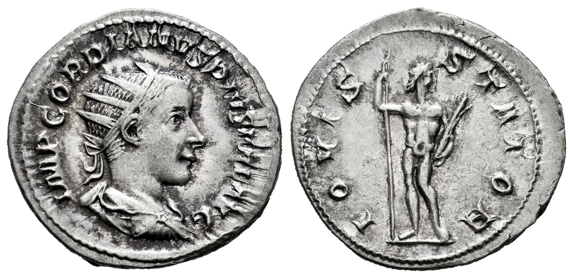 Gordian III. Antoninianus. 241-242 AD. Rome. (Ric-85). (Rsc-115). Anv.: MP GORDIANVS PIVS FEL AVG. Radiate, draped and cuirassed bust right. Rev.: IOVIS STATOR. Jupiter standing facing, head right, holding sceptre and thunderbolt. Ag. 3,73 g. Suave pátina con restos de brillo original subyacente. Acuñación perfectamente centrada. AU/XF. Est...70,00.