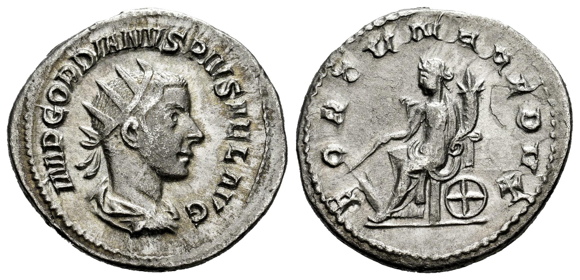Gordian III. Antoninianus. 243-244 AD. Rome. (Ric-IV 144). (Rsc-98). Anv.: IMP GORDIANVS PIVS FEL AVG, radiate, draped and cuirassed bust to right. Rev.: FORTVNA REDVX, Fortuna seated to left, holding rudder and cornucopiae; wheel under seat. Ag. 4,37 g. Choice VF/VF. Est...60,00.