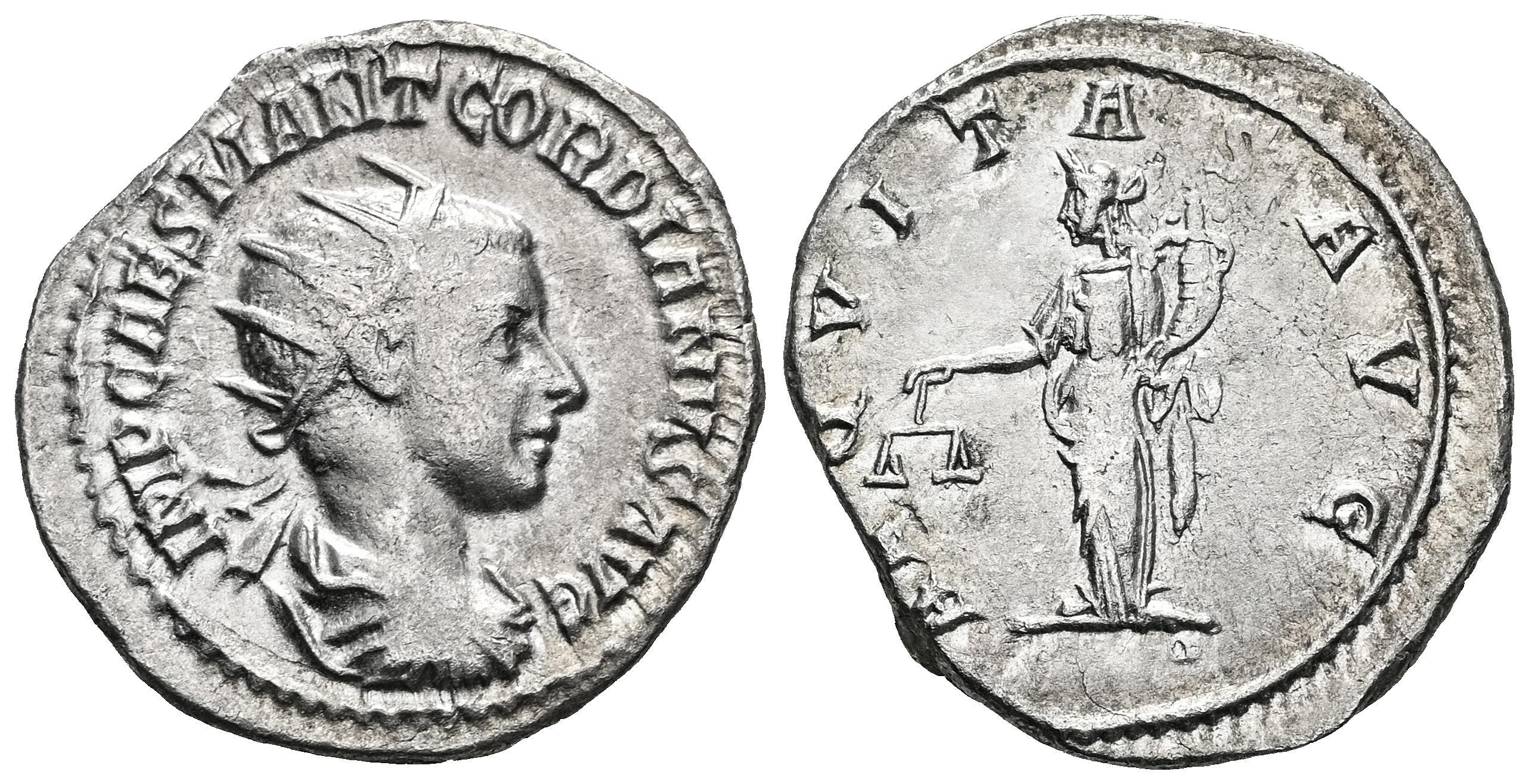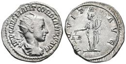 Gordian III. Antoninianus. 238-244 AD. Rome. (Ric-IV 177). (Rsc-17). Anv.: IMP CAES M ANT GORDIANVS AVG, radiate, draped and cuirassed bust to right. Rev.: AEQVITAS AVG, Aequitas standing to left with sceptre and scales. Ag. 4,22 g. Almost VF/VF. Est...35,00.