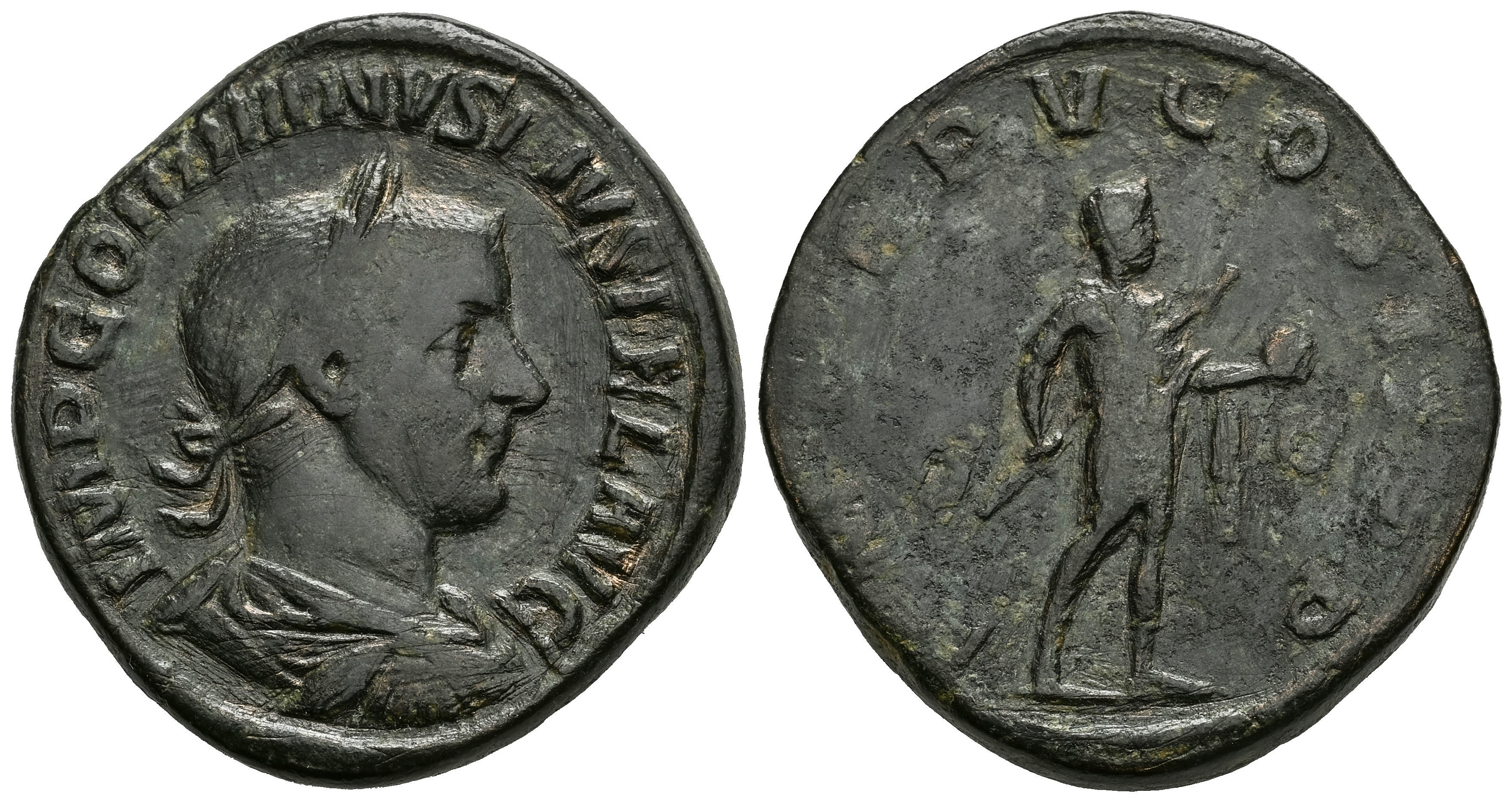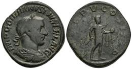 Gordian III. Sestertius. 241-244 AD. Rome. (Ric-IV 207a). (C-267). Anv.: IMP GORDIANVS PIVS FEL AVG, laureate, draped and cuirassed bust to right. Rev.: P M TR P V COS II P P, emperor standing to right, holding transverse spear and globe; S-C across fields. Ae. 21,60 g. Cleaning hairlines. VF/Almost VF. Est...80,00.