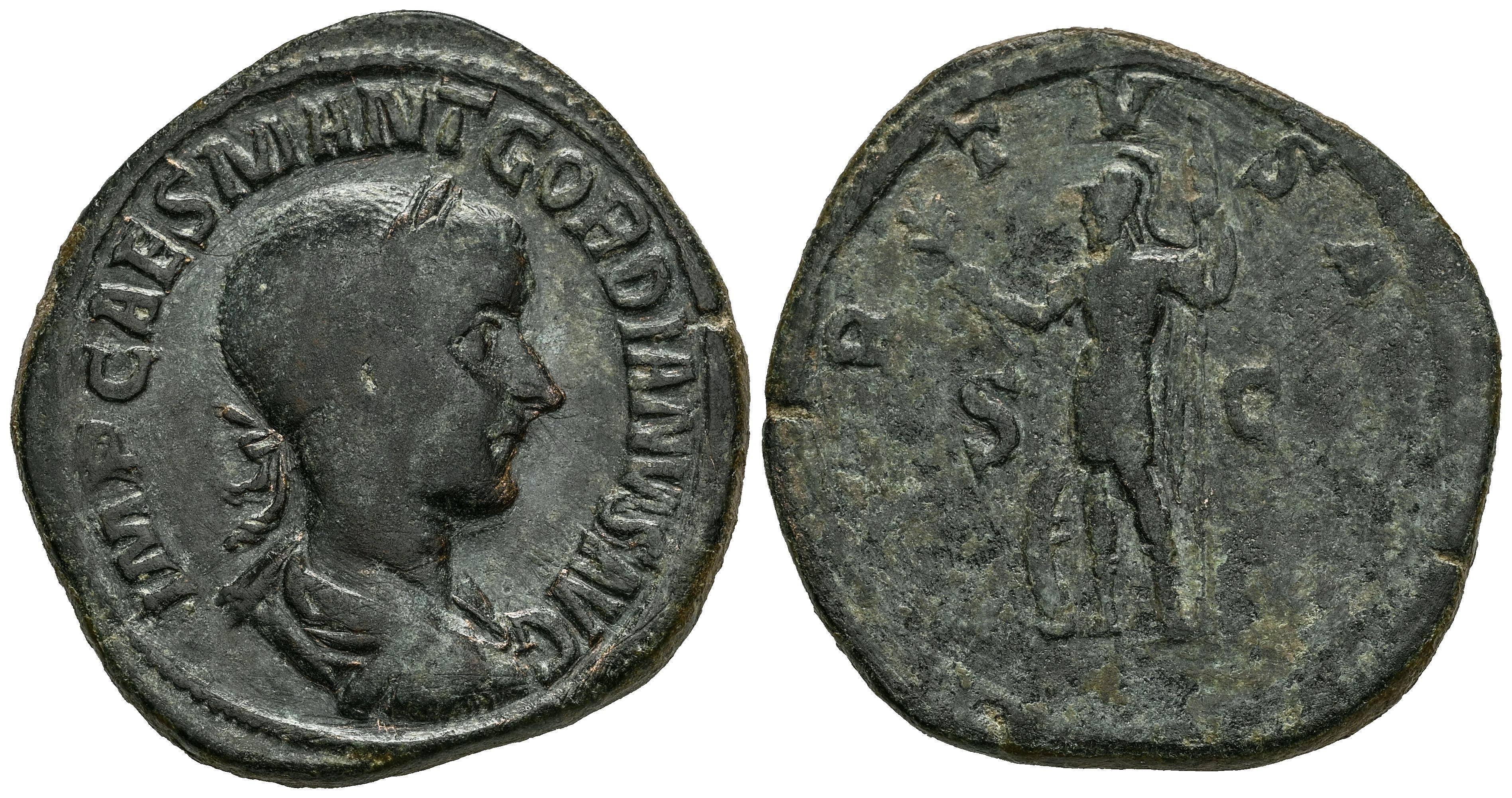 Gordian III. Sestertius. 240 AD. Rome. (Ric-IV 293a). (Banti-124). (C-390). Anv.: IMP GORDIANVS PIVS FEL AVG, laureate, draped and cuirassed bust to right. Rev.: VIRTVS AVG, Virtus standing to left, holding branch and vertical spear, shield resting against leg; S-C across fields. Ag. 23,44 g. Cleaning hairlines. Almost VF/Choice F. Est...80,00.